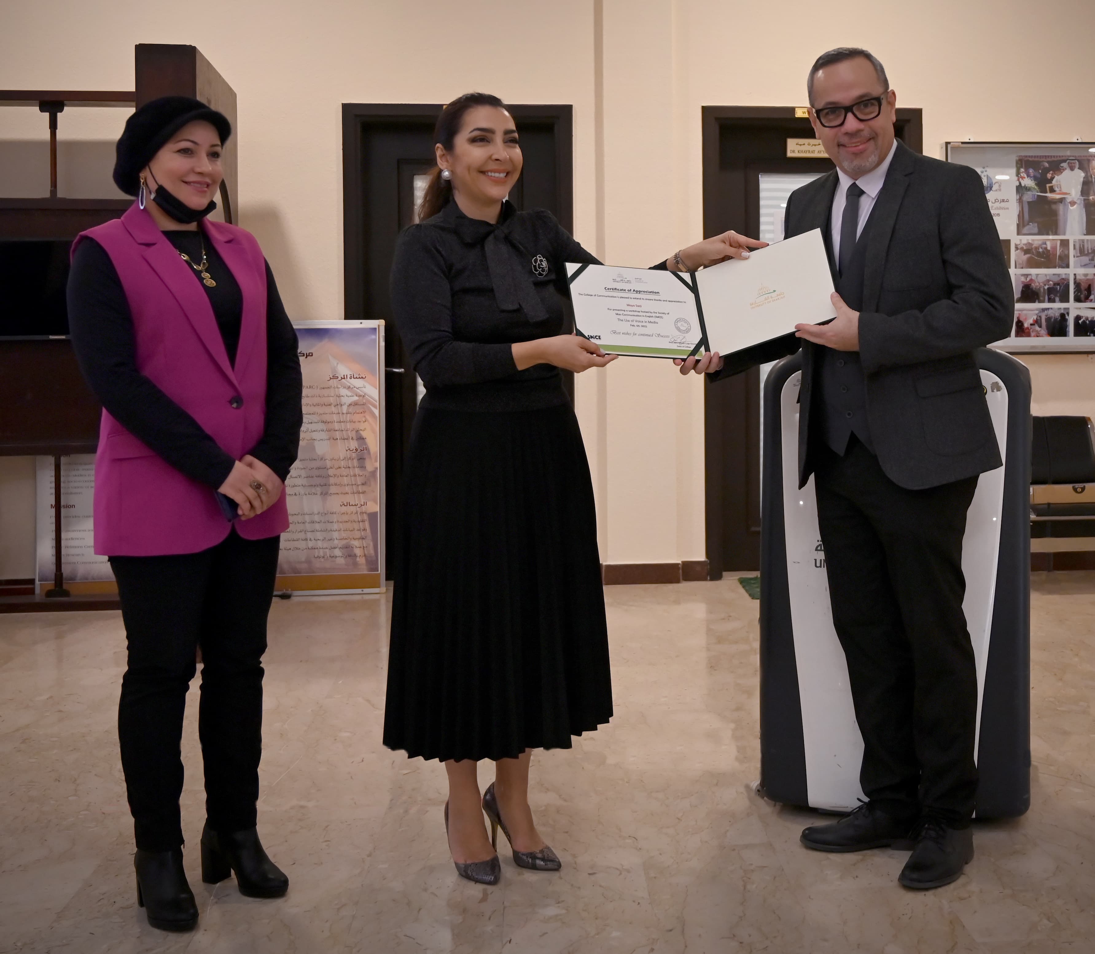 The event started with a welcoming speech from the Prof. Jairo Alfonso Lugo-Ocando, the Dean of the College of Communication, where he welcomed the attendees that were over 50 students and faculty and has welcomed Maya Sarji. The workshop ended with a Q and A session, followed by a certificate of appreciation that as presented to Maya by Prof. Jairo, Dr. Thouraya Snoussi, Assistant Dean, and Dr. Ogadimma, the program coordinator and the supervisor of the SMCE.