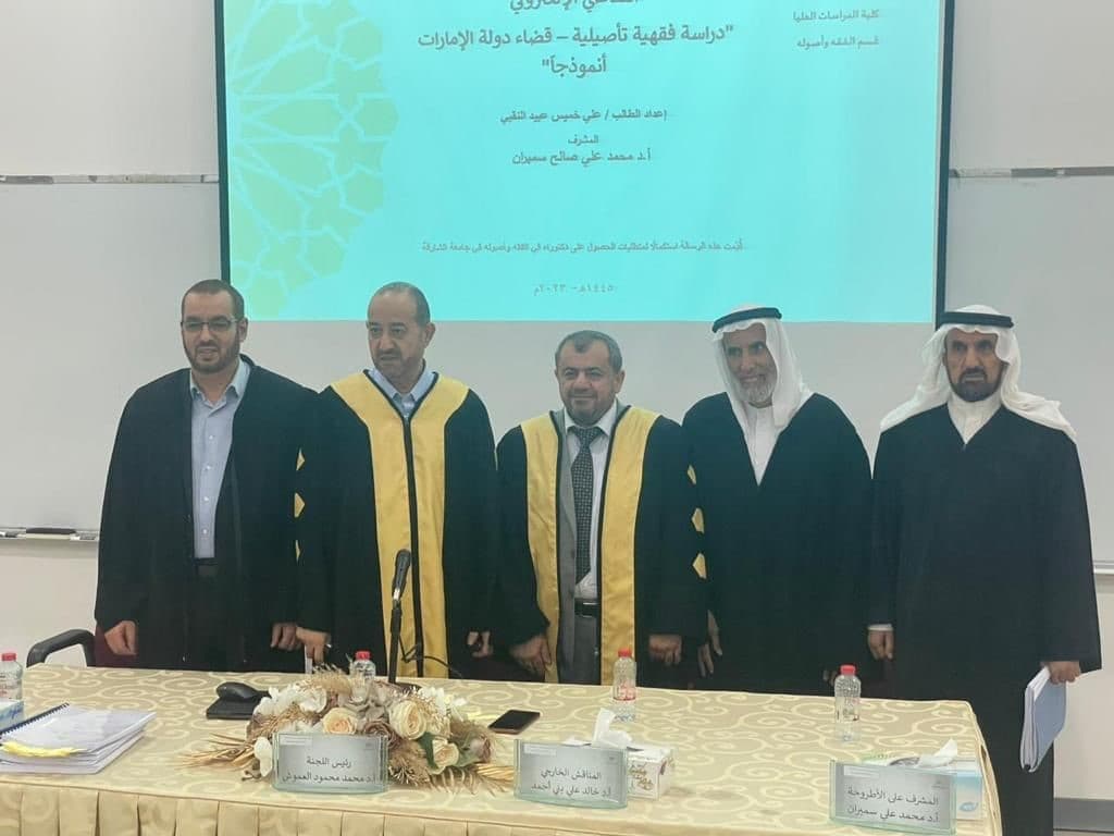 A PhD Dissertation in Hadith and its Sciences entitled: “The Hadiths that Contain the Statement of Imam Al-Tirmidhi, “We Do Not Know of It Except from This Route of Narration, A Practical Theoretical Study."was submitted for a Viva voce defense by Mr. Abdullah Muhammad Khalfan Ali Al Shamsi, a PhD student in the field of Hadith and its Sciences. The Viva Voce was held in the Ibn Hanbal Auditorium, Female Campus, College of Shari’ah and Islamic Studies, on Thursday, December 14, 2023, at 2pm. The viva voce committee consisted of Prof. Abdal Samee Al-Aniess (thesis supervisor), Prof. Abdul Aziz Shaker Al Kubaisi (external examiner), Prof. Kassem Ali Saad (internal examiner and chair of the committee) and Dr Fatima Zohra Aouati (second internal examiner).