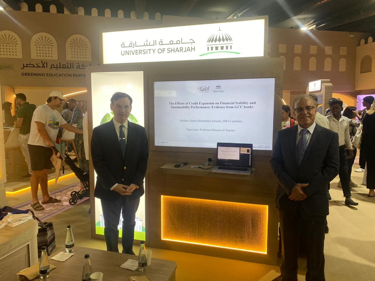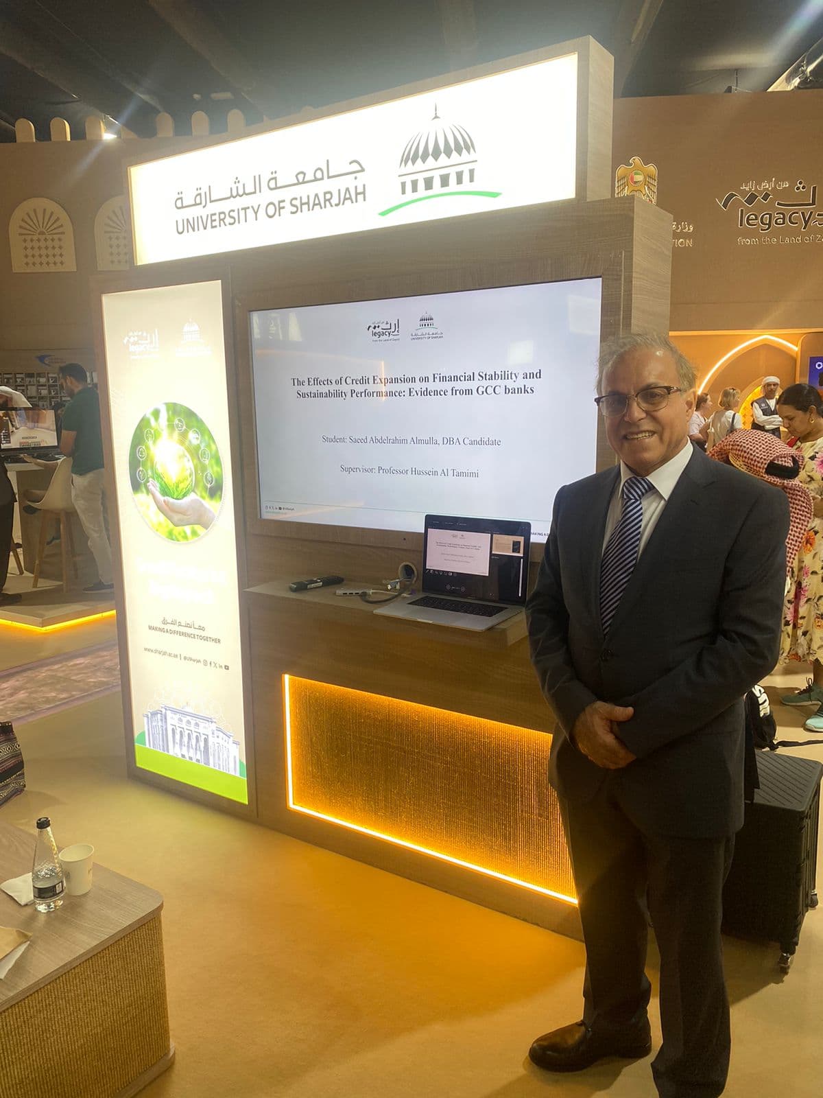 The Dean of the College of Business Administration Prof. Ilhan Ozturk along with the Vice Dean Prof. Mohammad Al-Hawari and Head of the Management Department Dr. Shaker Bani Melhem have visited the University of Sharjah stand in Cop28. CoBA has represented the University of Sharjah in Cop28 through several activities. One of these activities was a session and panel discussion on the topic of Financial technology at UAE: Current and future perspective presented by Dr. Noura Metawa, Assistant Professor of Finance. Another contribution for CoBA was through two research papers. The first presentation was by the DBA Candidate Mrs. Jawahir AlShehhi who has presented a paper entitled The effect of institutional factors on environmental efficiency: A cross-country analysis using a Bayesian data envelopment analysis approach under the supervision of Dr. Panagiotis Zervopoulos, Director of DBA Program and Associate Professor of Management and the second presentation was by the DBA candidate Mr. Saeed Abdelrahim Almulla who has presented a paper entitled The effects of credit expansion on financial stability and sustainability performance: Evidence from GCC banks under the supervision of Prof. Hussein Al Tamimi, Director of EMBA and MBA Programs and Professor of Finance. And finally, Prof. Ramakrishnan Ramanathan, Professor of Management delivered a session on Exploring the use of digital technologies for sustainability and GHG reductions in UAE Food Supply Chains DigiFood