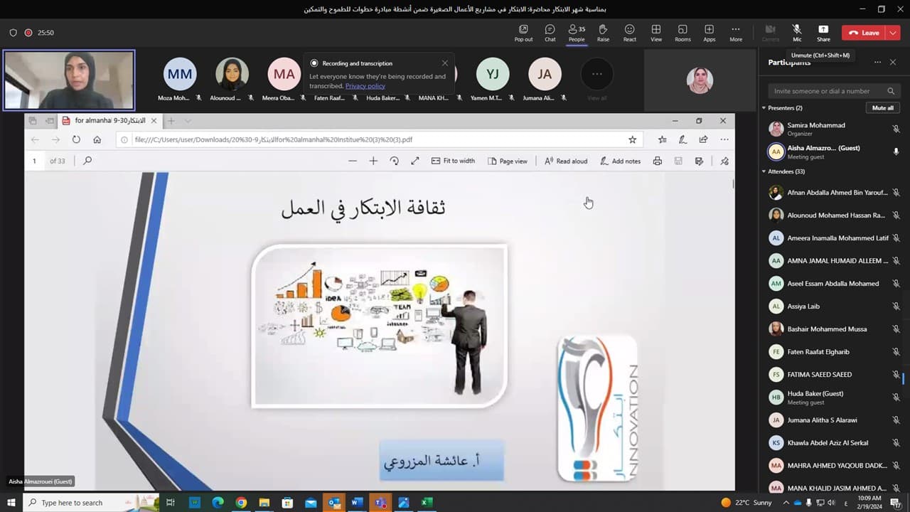As part of the "Steps to Ambition and Empowerment" initiative / Entrepreneurship and Sustainability Program, the Department of Student Activities at the Deanship of Student Affairs organized a virtual lecture for Innovation Month titled "Innovation in Small Business Projects." The lecture was presented by trainer Ms. Aisha Mohammed Saeed Al Mazrouei and was attended by many members of the university community. The lecture aimed to introduce the concept of innovation, its types, and its importance for different sectors. It also discussed the qualities of an entrepreneur, the relationship between innovation and entrepreneurship, and how to develop small projects through innovation.