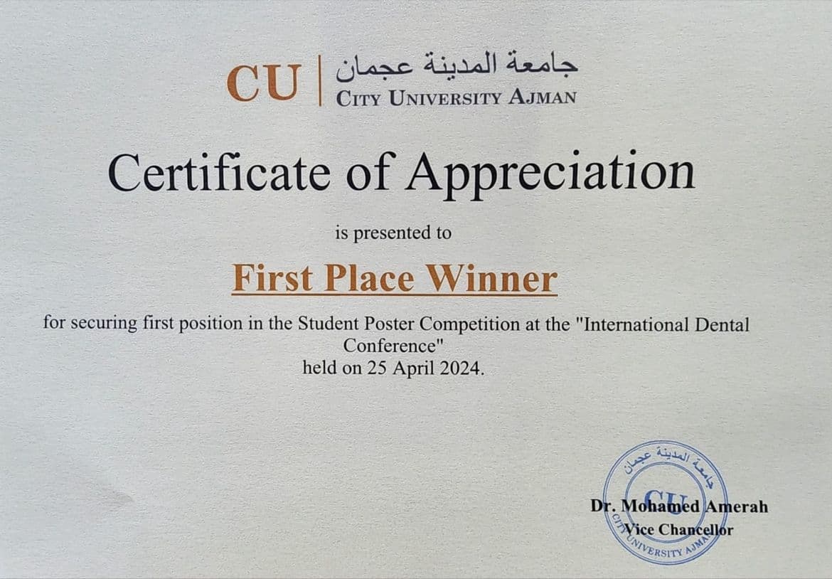 First Place Winner In Student Poster Competition At City University Ajman International Dental Conference