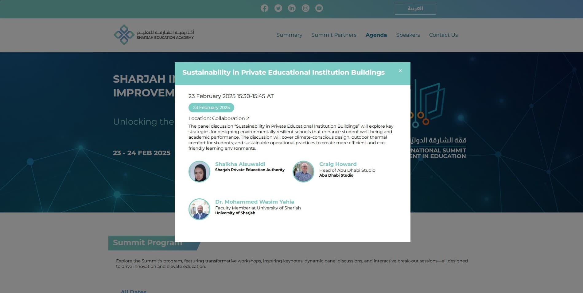 The University of Sharjah was represented at the Sharjah International Summit for Improved Education during a panel discussion titled “Sustainability in Private Educational Buildings” with the participation of Dr. Mohammed Waseem Yahya from the Department of Architecture, Master of Science student Sheikha Butti Al Madhloum, and Craig Howard, Director of BDP Abu Dhabi. Several design ideas were discussed in depth during the summit and key strategies were presented for designing environmentally resilient schools that enhance student well-being and academic success. The discussions covered several critical topics, including climate-conscious design, ensuring outdoor thermal comfort for students, and implementing sustainable operating practices to promote more efficient and environmentally friendly learning environments.