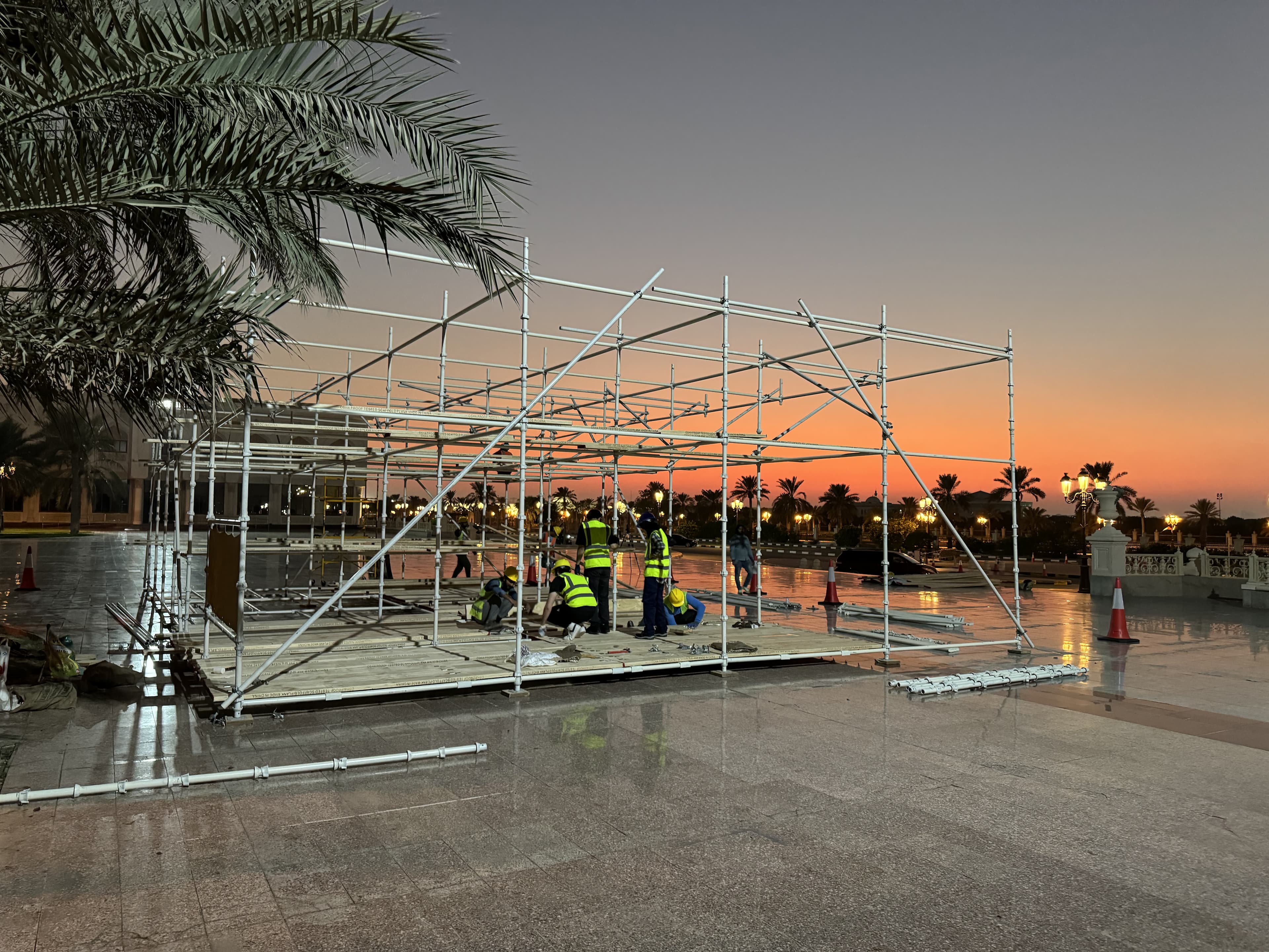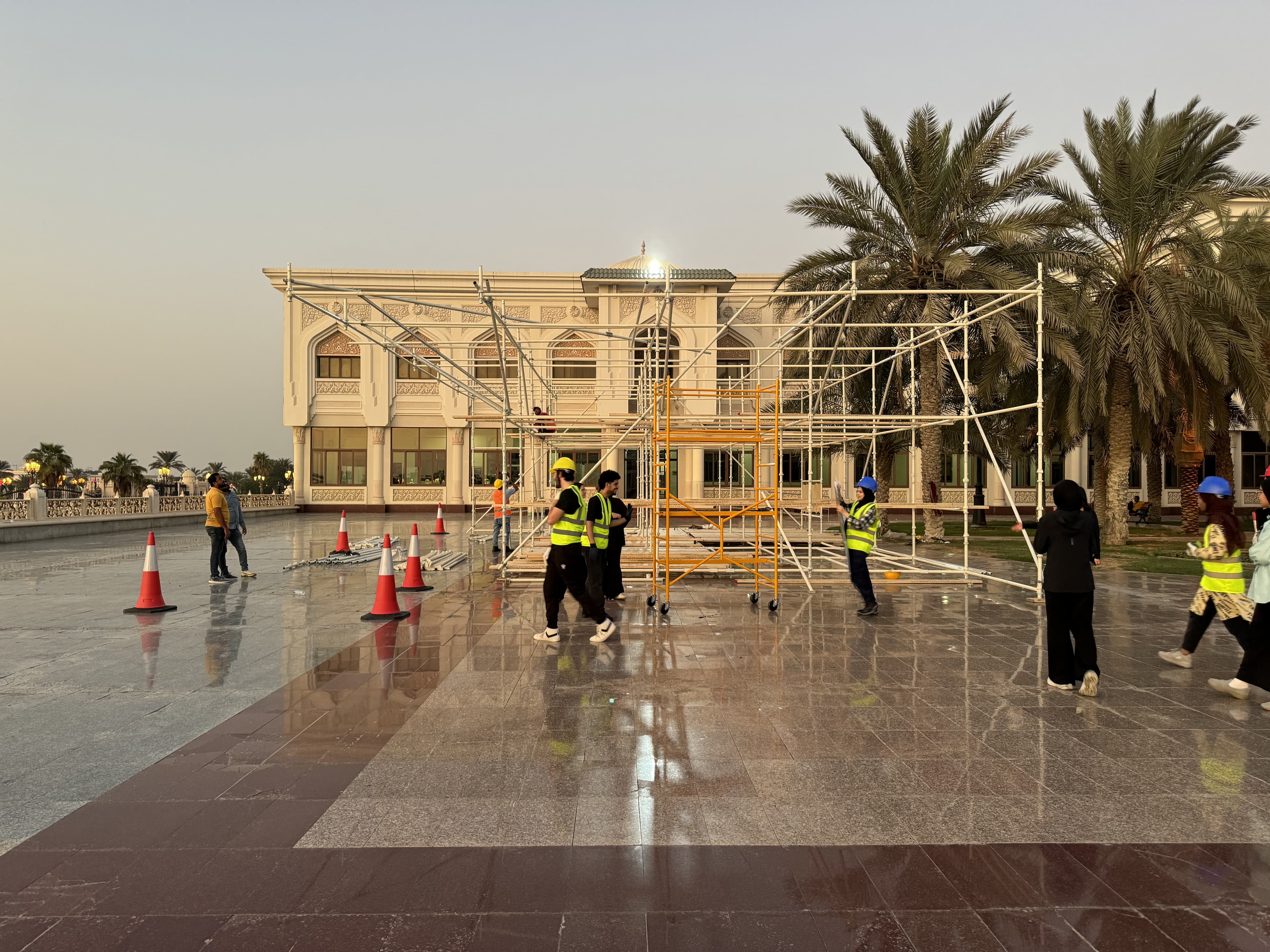 The construction of the pavilion, in its pilot year, will become an annual activity, to offer all students a comprehensive educational opportunity to deal with a real-world full construction process, dealing with university-external dynamics and with the complexity of a real-world construction site. A team of students, guided by instructors and supported by contractors, applied what they learnt during their academic career. Not only this experience turned theory into practice, but it could open new horizons for students in terms of understanding and experiencing the construction process in real life, yet with simple and safe tools. The pavilion is built by means of modular scaffolding units, cladded with lightweight and safe-to-instal outdoor shading fabric. Several designed proposals for the pavilion were designed by students in a workshop in September. In the second phase, the team re-engineered the final solution, including the budget estimation and construction phase planning. Then students have contributed with the project management, and especially dealing with contractors and material suppliers. And finally, the construction phase started in early November until building completion by UAE National Day celebrations.Besides offering a valuable but intangible educational experience to students, the small temporary pavilion is a tangible benefit for the University, complementing winter-time events and activities such as National Day, Open Day, Global Day, Padel tournament, etc.