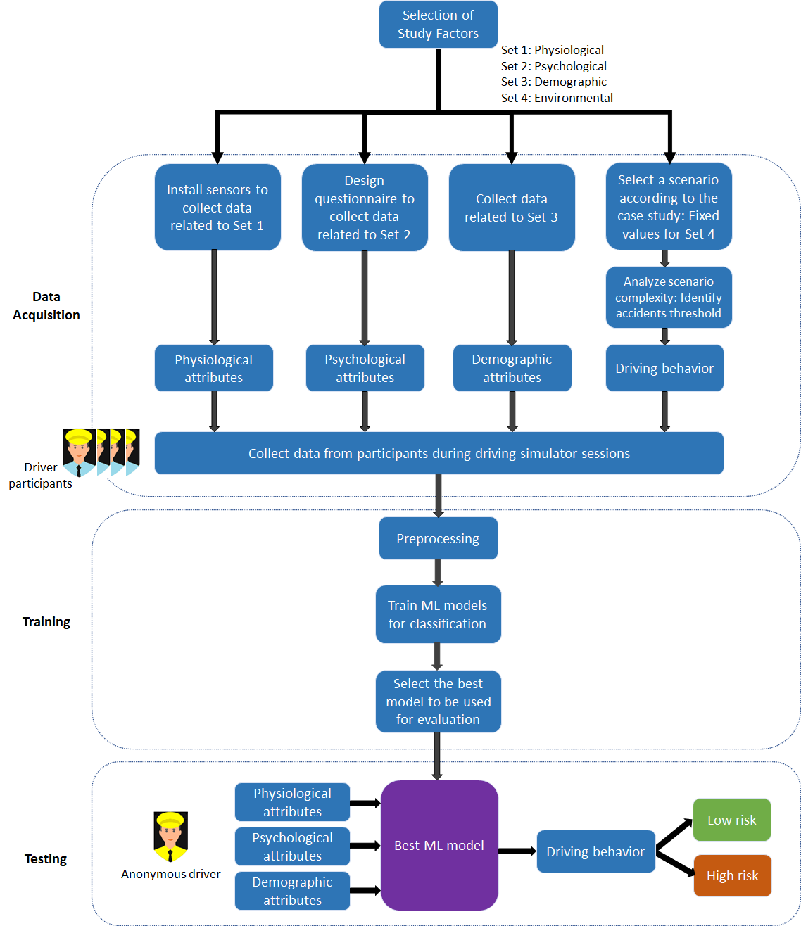 On a real problem with the taxi industry in the UAE utilizing the Smart Manufacturing Lab facilities (driving simulator). The study introduces an innovative Machine Learning framework that can support taxi companies in enhancing driver recruitment and fleet safety by identifying low-risk drivers through psychological, physiological, and demographic assessments.