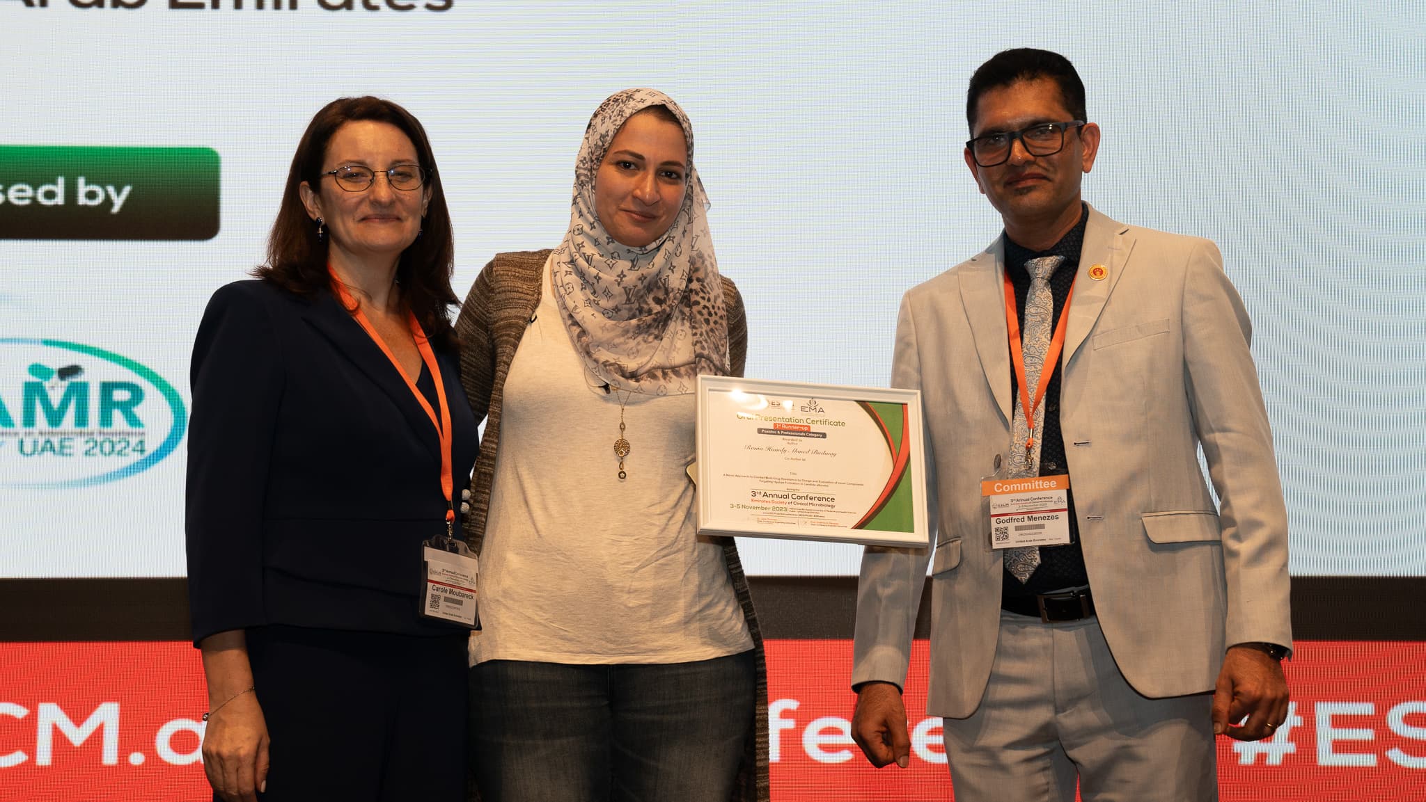 Poster title: "CRISPR-Cas9 as a Potential Therapeutic Platform for Breast Cancer." Students: Munazza Ahmed and Grace Daoud. Awarded at the Dubai International Pharmaceuticals and Technologies Conference and Exhibition (DUPHAT), Dubai, UAE.