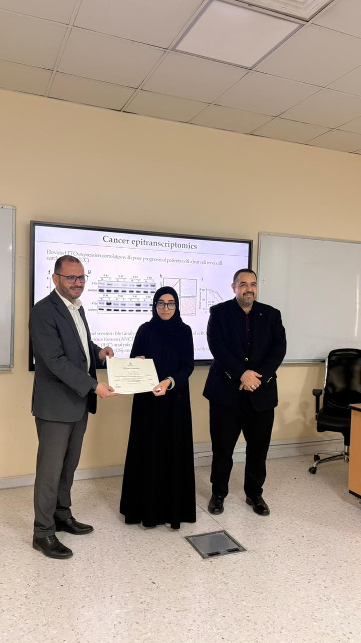 The lecture was delivered by Dr. Muna Alhammadi, Scientific Researcher at the Sharjah Seed Bank and Herbarium, University of Al Dhaid.Lecture Title: The Hidden Layer of Gene Regulation: How Epitranscriptomics is Shaping the Future of Drug Discovery This lecture provided valuable insights into the emerging field of epitranscriptomics and its role in advancing modern drug discovery.