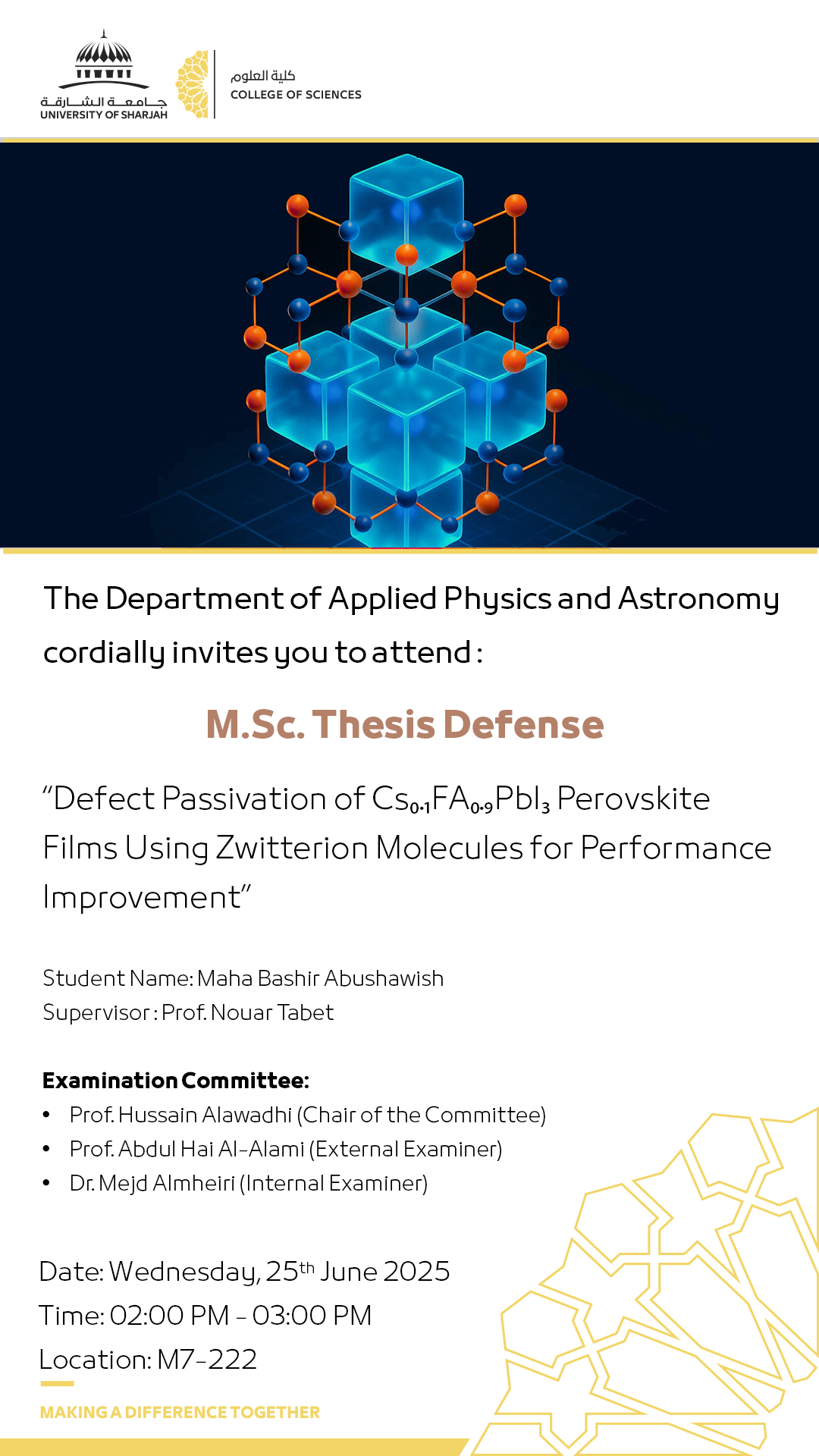 M.Sc. Thesis Defense : “Defect Passivation of Cs₀.₁FA₀.₉ PbI₃ Perovskite Films Using Zwitterion Molecules for Performance Improvement” by Maha Bashir Abushawish