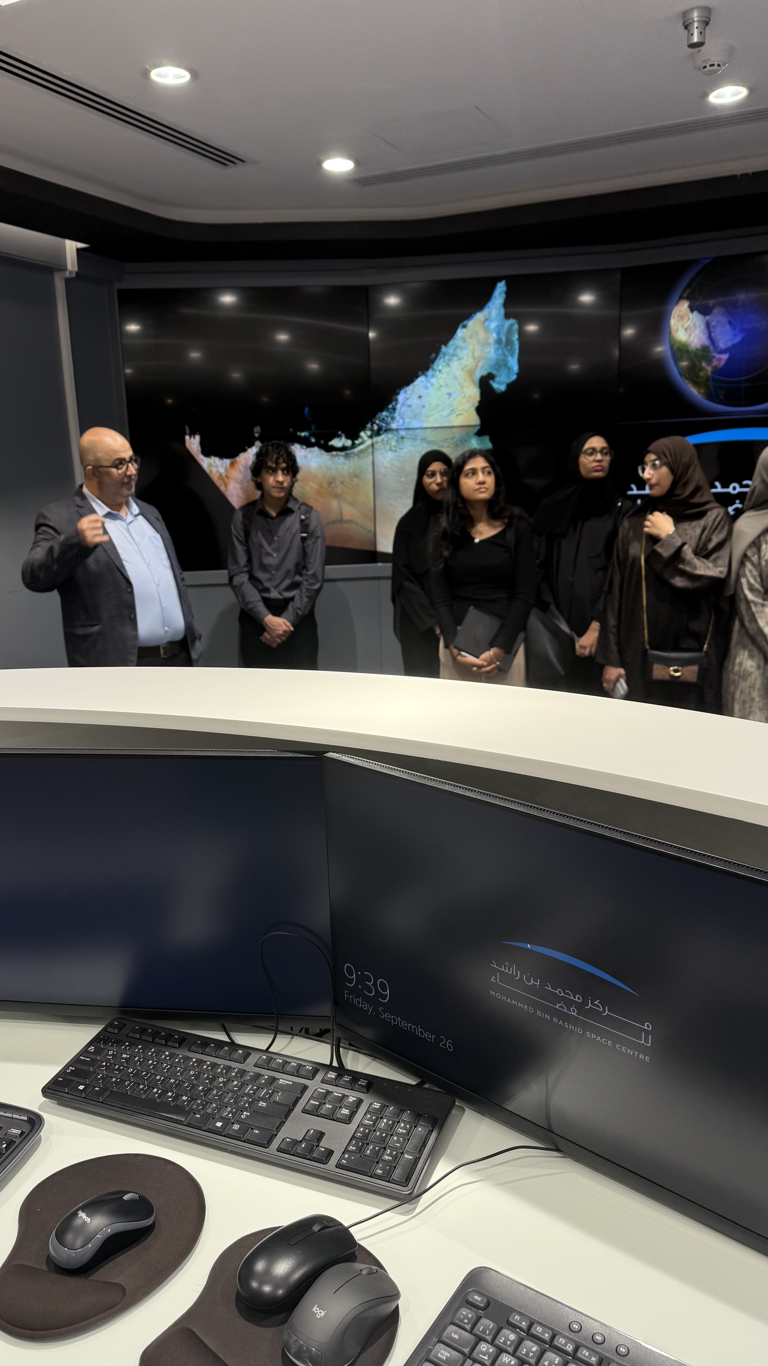 On 26 September 2025, students from the Petroleum Geosciences and Remote Sensing (PGRS) program visited the Mohammed bin Rashid Space Centre (MBRSC) as part of their Geologic Remote Sensing course. A few students from the Applied Physics program also joined the trip. The students were given a guided tour of the facility and its laboratories, engaging in insightful discussions about the UAE’s space missions.