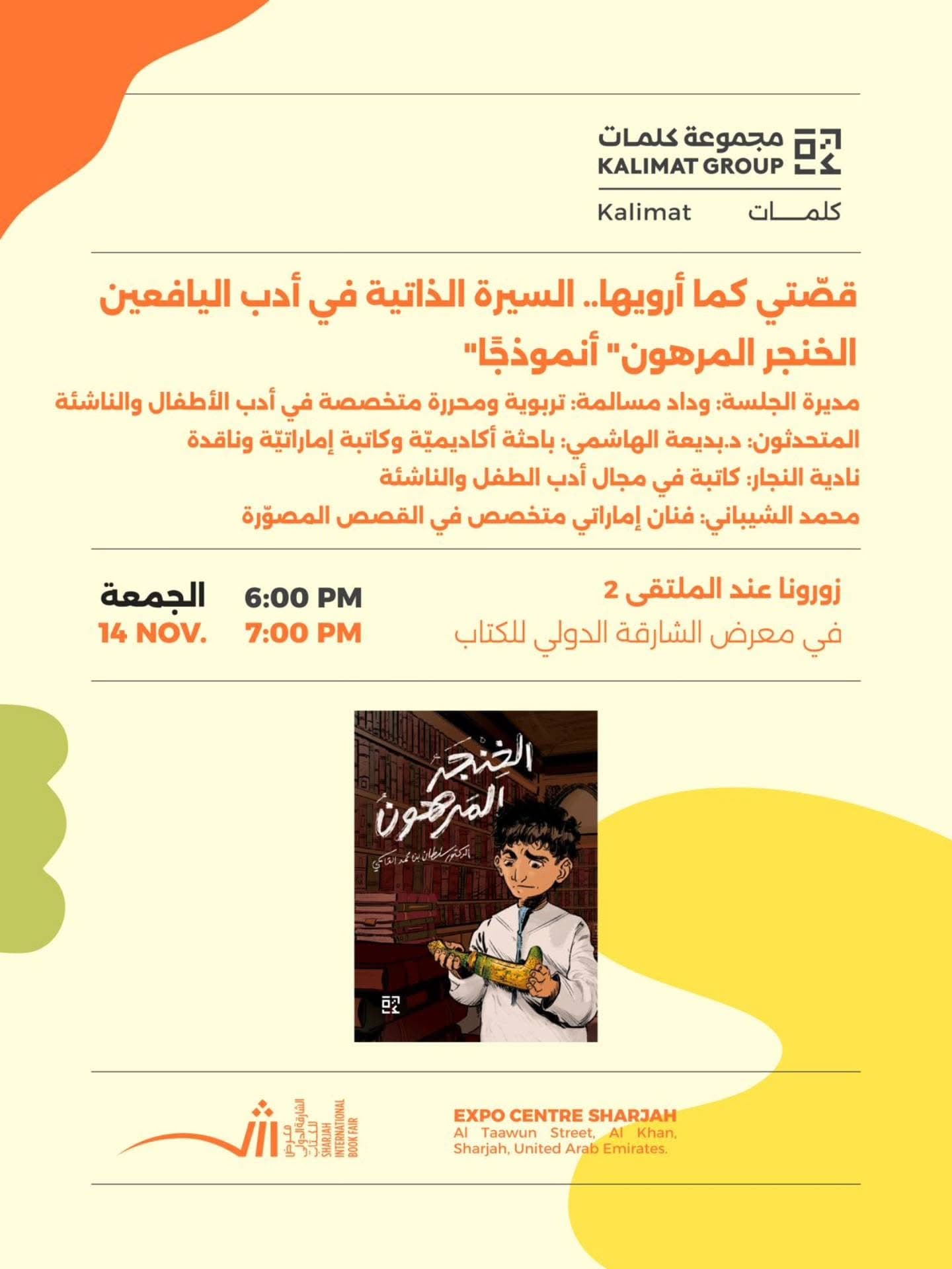 Associate Professor Badeeah Al Hashemi, Head of the Department of Arabic Language and Literature, participated on November 14, 2025, in a panel discussion titled: "My Story as I Tell It… Autobiography in Young Adult Literature: The Pawned Dagger as a Model," authored by His Highness Sheikh Dr. Sultan bin Muhammad Al Qasimi. The session was organized by Kalimat Group, Sharjah as part of its activities at the 44th edition of the Sharjah International Book Fair 2025.