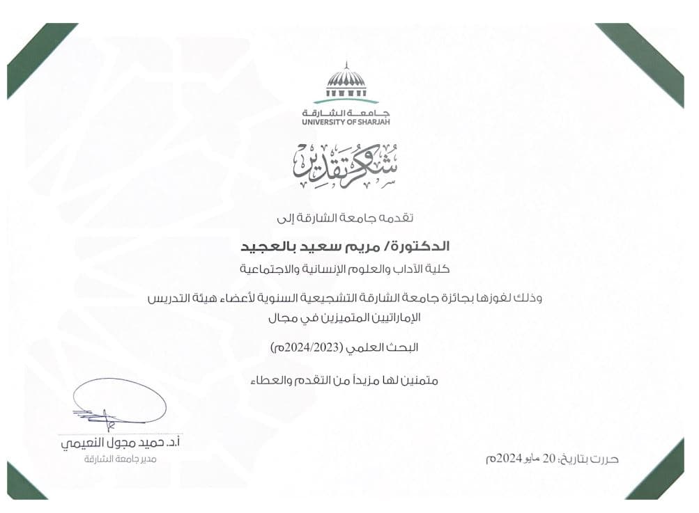 Dr. Mariam Balajeed Wins the Sharjah Annual Incentive Award for Outstanding Emirati Faculty Members in Scientific Research – University of Sharjah – 2023/2024