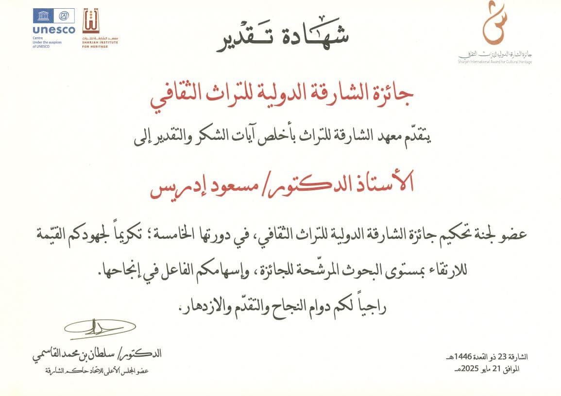 The Sharjah Institute for Heritage extends its sincere thanks and appreciation to Professor Dr. Masoud Idris. Member of the Judging Committee for the Sharjah International Award for Cultural Heritage – Fifth Edition, in recognition of your valuable efforts in elevating the quality of the nominated research.