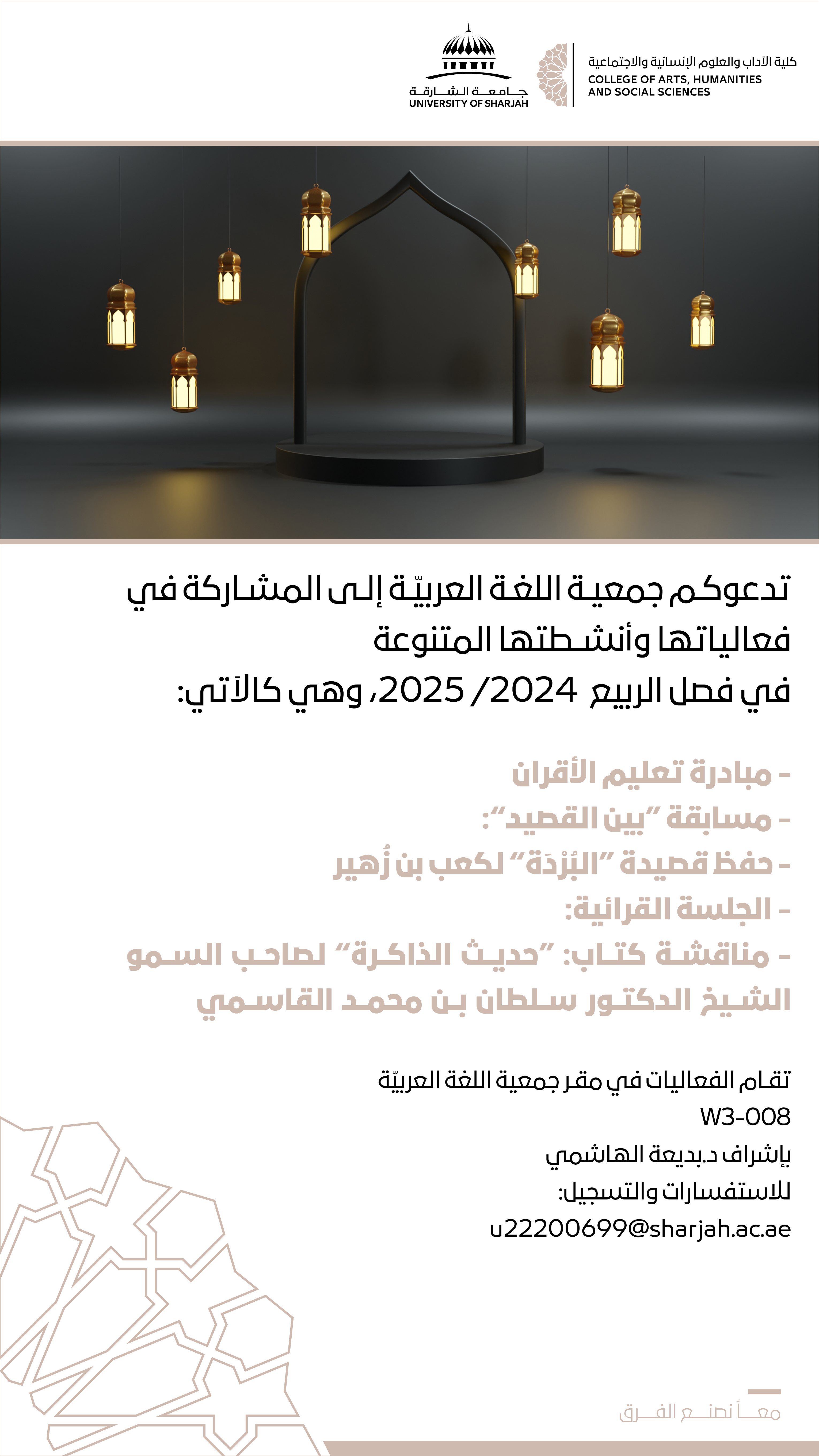 The Arabic Language Association invites you to participate in its various events and activities for the spring semester of 2024/2025, as follows: