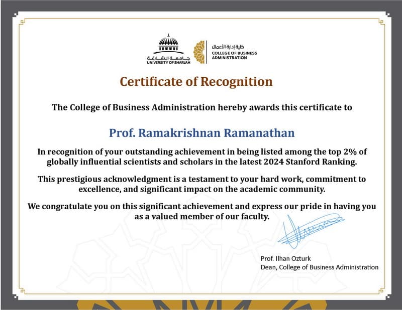 Name: Professor Ramakrishnan Ramanathan Category: Research Award Title: Top 2% research rank Awarding Organization: Stanford Research ranking Brief Description: Professor Ramakrishnan Ramanathan has been ranked in the top 2% of globally influential scientists and scholars in the latest 2024 Stanford Ranking. Date: October 2024