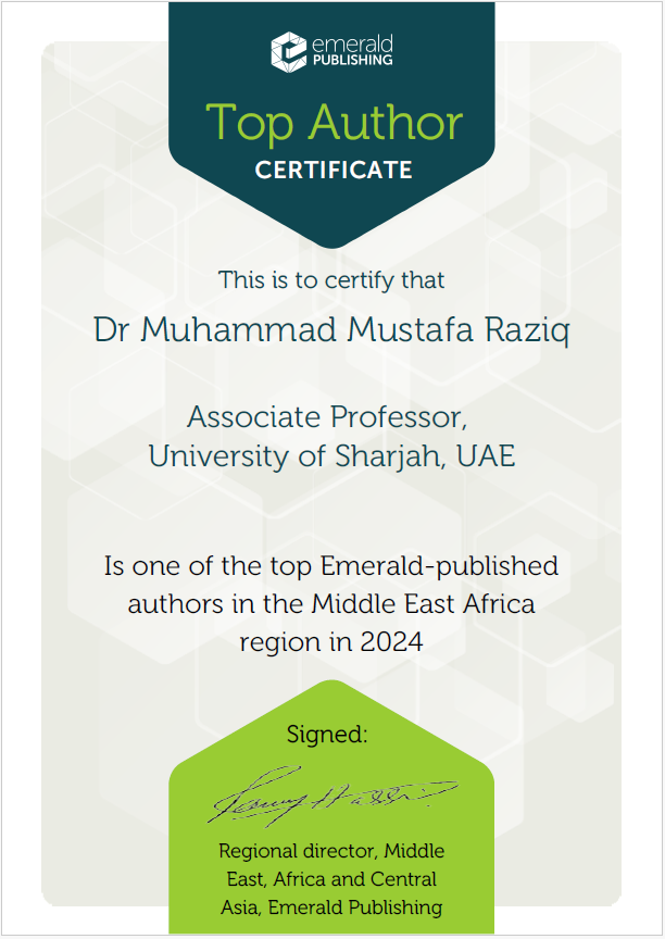 Brief Description: Received top author certificate based on the number of publications in Emerald Journals in year 2024. Ranked number 5 in all Middle East, Africa, Türkiye & Pakistan (MEA) region.