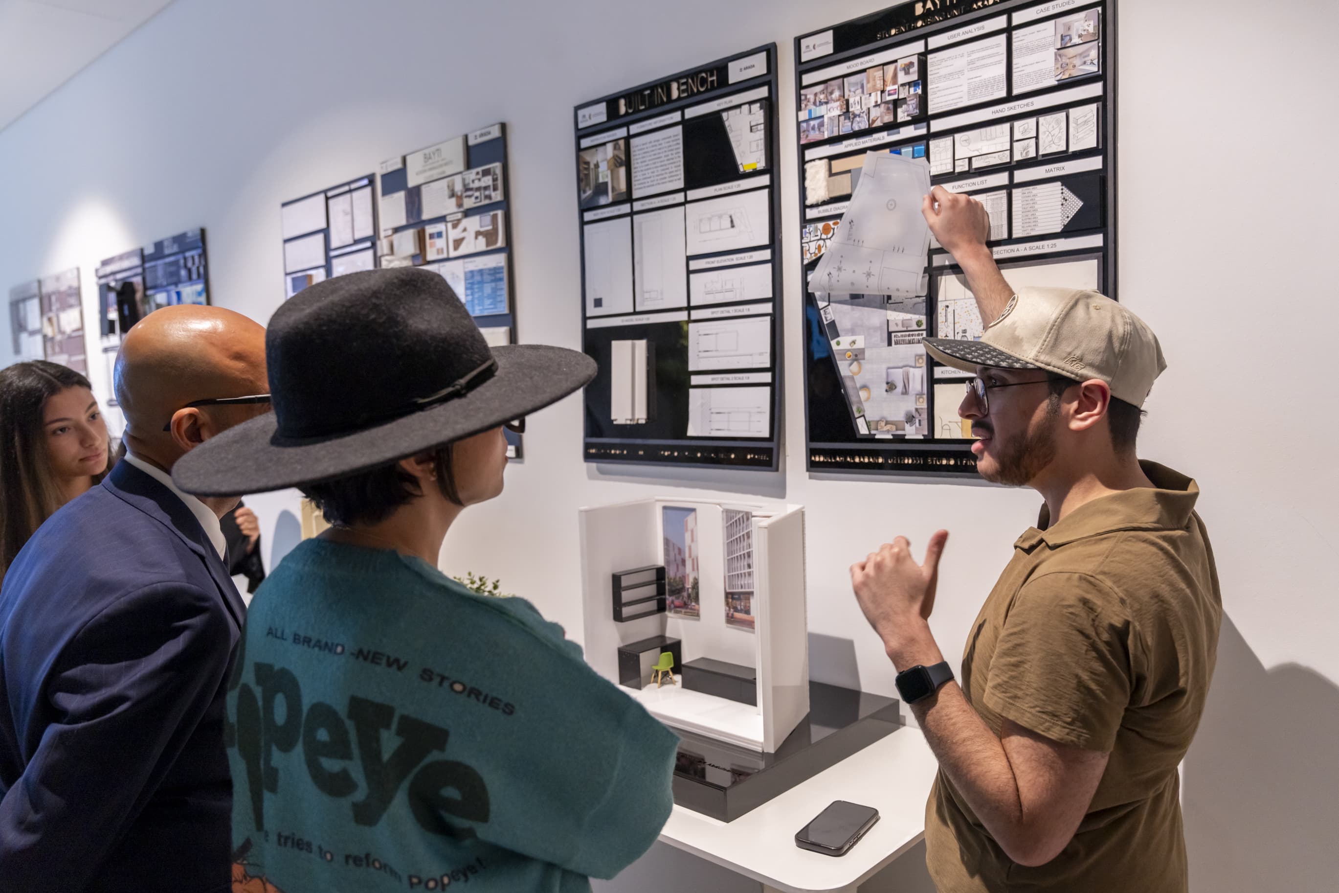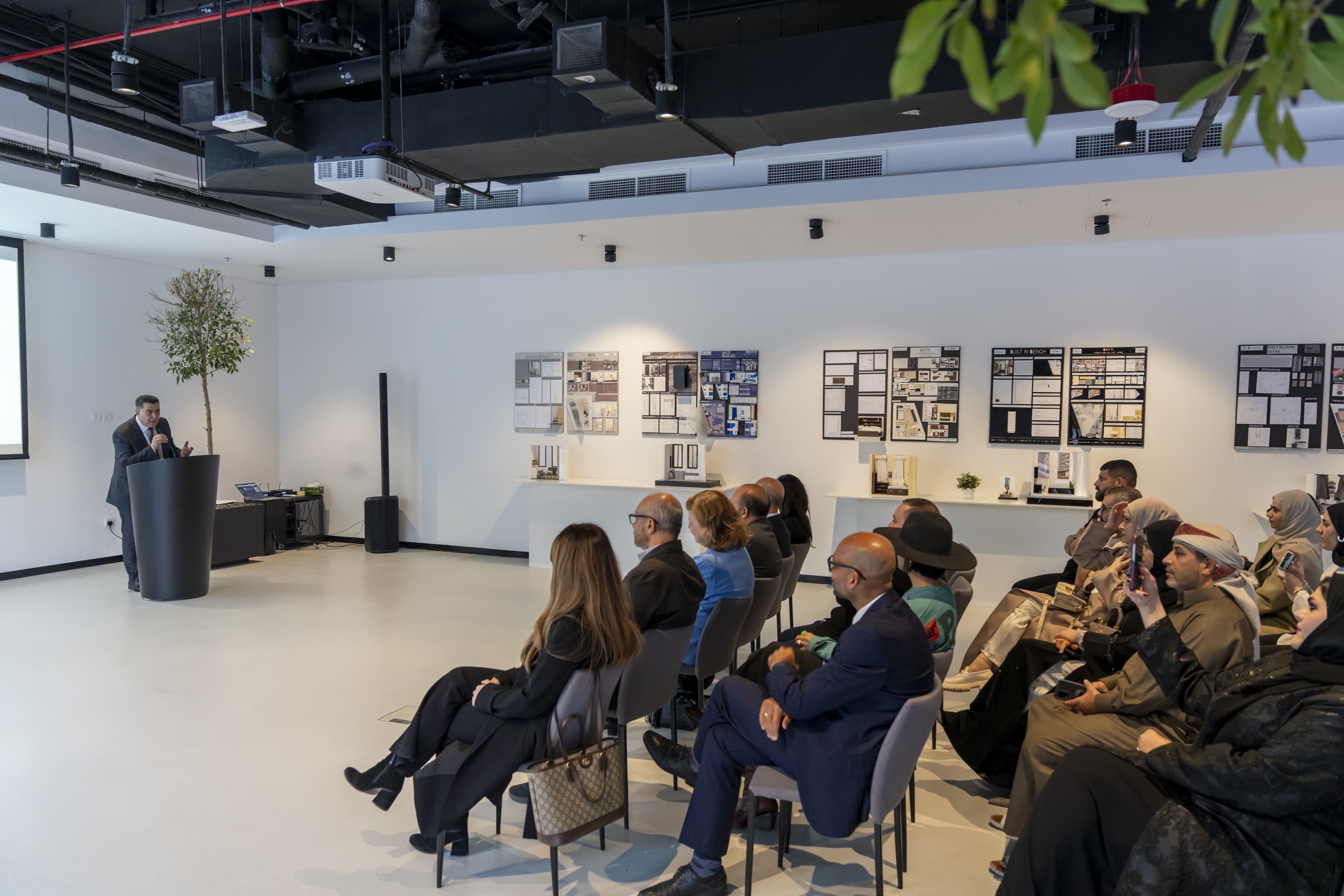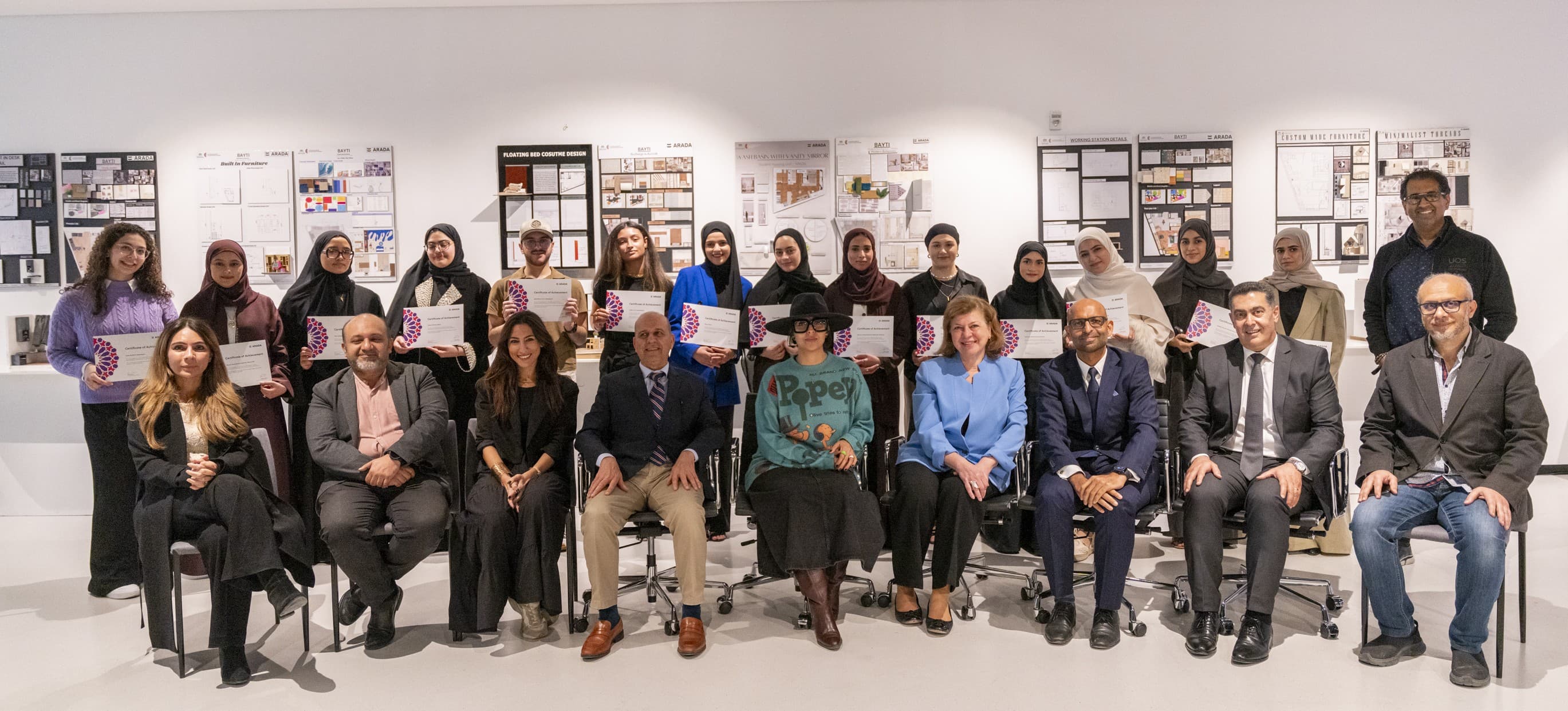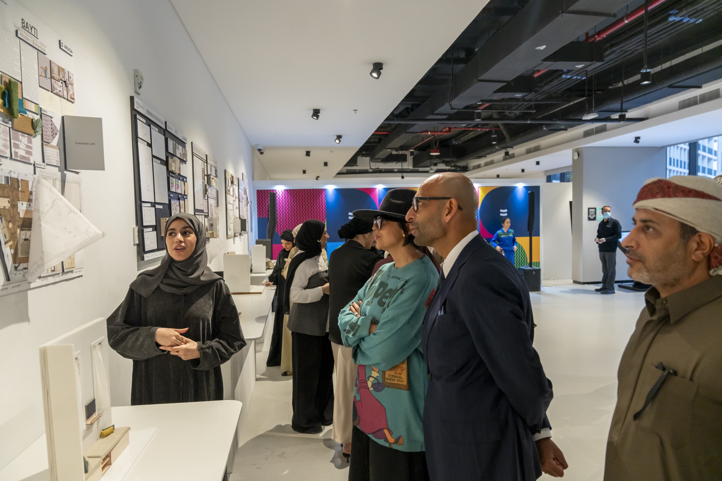 Arada team welcomed CFAD’s interior design sophomore students for a Spring 2025 exhibit at Nest’s multipurpose room. The exhibition “Bayti-My Home” showcased select design projects focused on residential design, with an emphasis on universal design principles. Each project explored the design of a student accommodation unit at NEST, by Arada. Students were tasked with interviewing a potential client, a student enrolled in one of the following programs: Medical Sciences, Fashion Design, Business, or Engineering. Each student was assigned a specific program and worked closely with their client to understand their needs, lifestyle, and requirements. The challenge was to design a small yet functional space, incorporating areas for sleeping, resting and study/work, a kitchenette and bathroom, all while keeping universal design at the forefront. Design and Interior Construction faculty collaborated to bring students’ concepts to life, encouraging them to explore their design ideas in greater detail and produce a comprehensive final project. Exhibit curator Ms. Georgina Abood, Dr. Abdul Samad Alkhalidi. Ms. Asil Albaghdadi, and Mr. Akrami Azmy were the faculty team behind the success of the Bayti project. Special recognition to the Arada team for sharing their expertise with students and hosting the exhibit. This collaboration between academia and industry has been a vital source of inspiration and support as students begin experiencing aspects of the future careers early in their studies through direct interactions with the professionals.