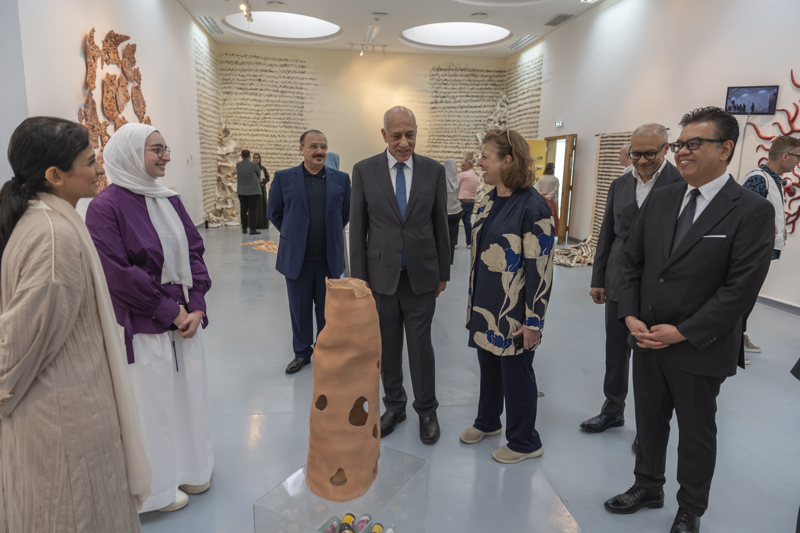The College of Fine Arts and Design (CFAD) reached a milestone with Exit Show 20, celebrating 20 years of creative endeavors in which the College presents its seniors to the world in open exhibitions across its galleries and studios. It also sets a record as the largest with 109 participants. The occasion marks the college’s commitment to uphold a tradition followed by many art and design institutions. The occasion was inaugurated by His Excellency Professor Esameldin Agamy, Chancellor of the University of Sharjah, and attended by invited guests, faculty, staff, and students. Each exit project represents an independent exploration taken by a senior student during their final year. It is further enhanced by the students’ experience during their internship. The Exit Show reflected the uniqueness of our program offerings and the diversity of projects explored. Whether fine arts, fashion design and textiles, interior design, or visual communication, they share a commitment to pushing the boundaries of the creative process.