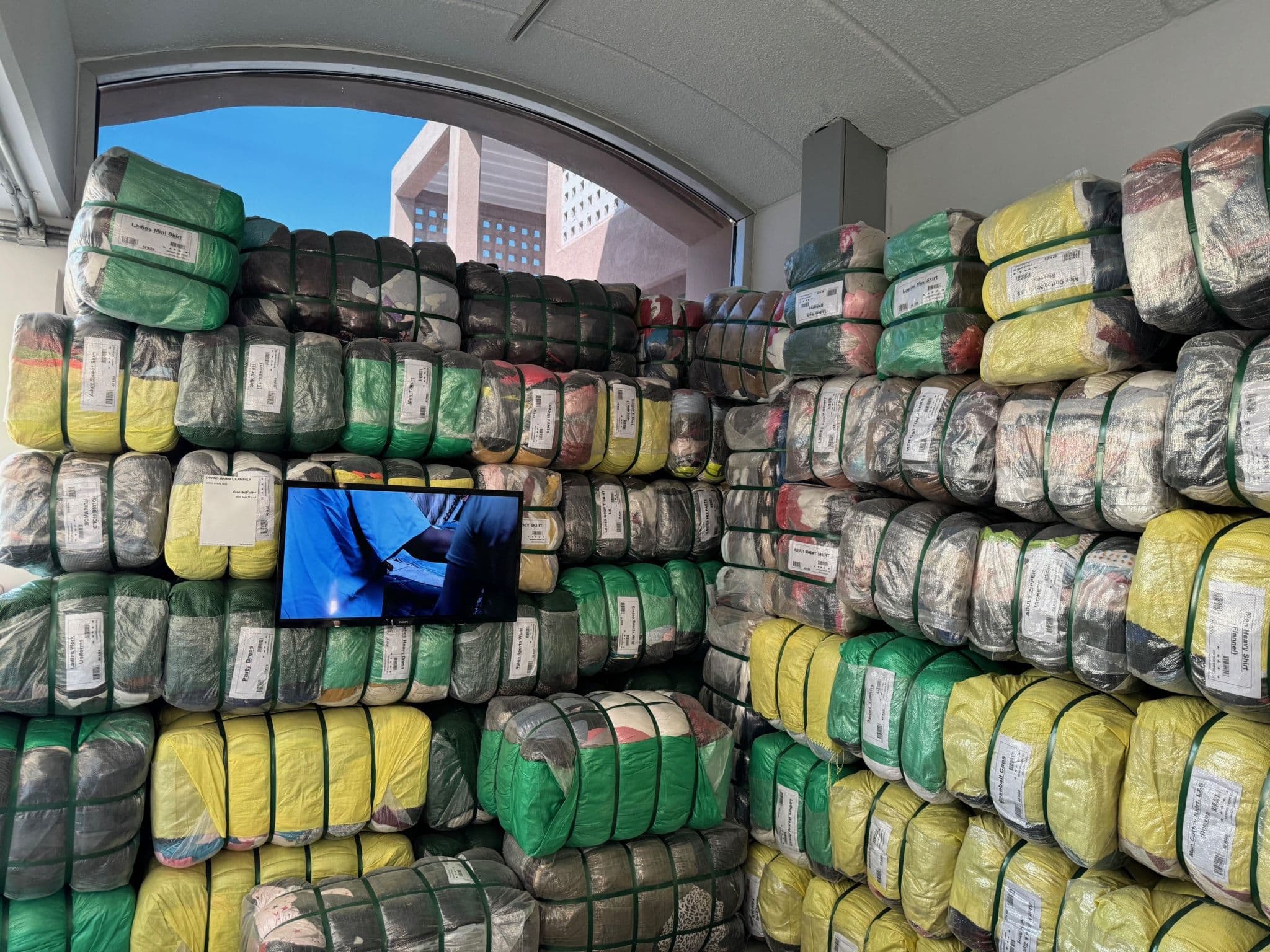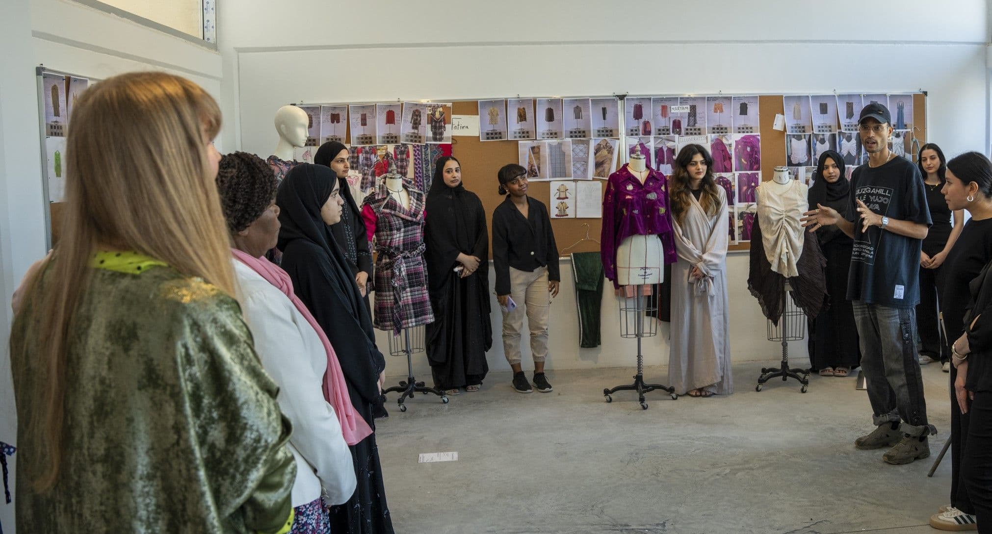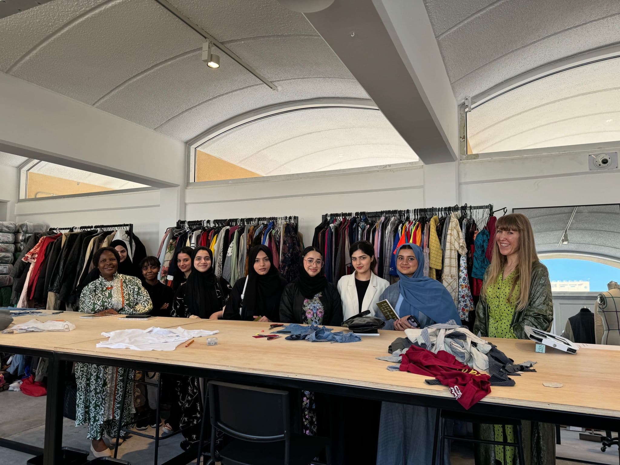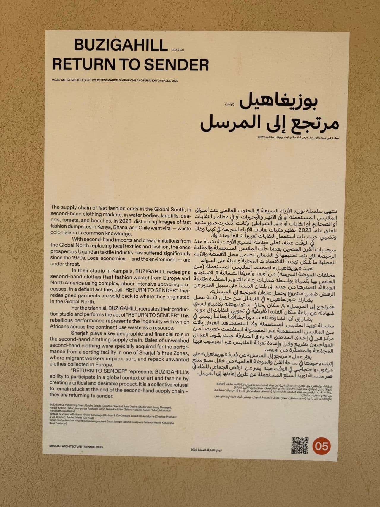 Kampala-based Fashion Designer Bobby Kolade's brand BUZIGAHILL is committed to “redesign(ing) second-hand clothes and redistribute(ing) them to the Global North, where they were originally discarded before being shipped to Uganda." Their project, Return to Sender, is responding to the alarming explosion of discarded second-hand clothes that is becoming a major environmental burden. In partnership with the Sharjah Architecture Triennale and as part of its 2023 event themed “The Beauty of Impermanence: An Architecture of Adaptability," Bobby led an intensive eight-day workshop with eight fashion design students focused on upscaling second-hand garments with zero-waste. The experiment culminated in an innovative collection that showcased the validity of the project and participants' creative skills to rethink fashion design in a sustainable and responsible manner. Students included Ameena Punnilath, Azza Rashed, Bushra Shakil Sawant, Fatima Mohamed, Lana Adham, Mariam Mohamed, Maryam Masroor, and Naswa Puttekkadan. The team was led by Ms. Alina Erimia (Lecturer in Fashion Design and Textiles), with the support of Ms. Polite Mangoro (Fashion Design Technician).