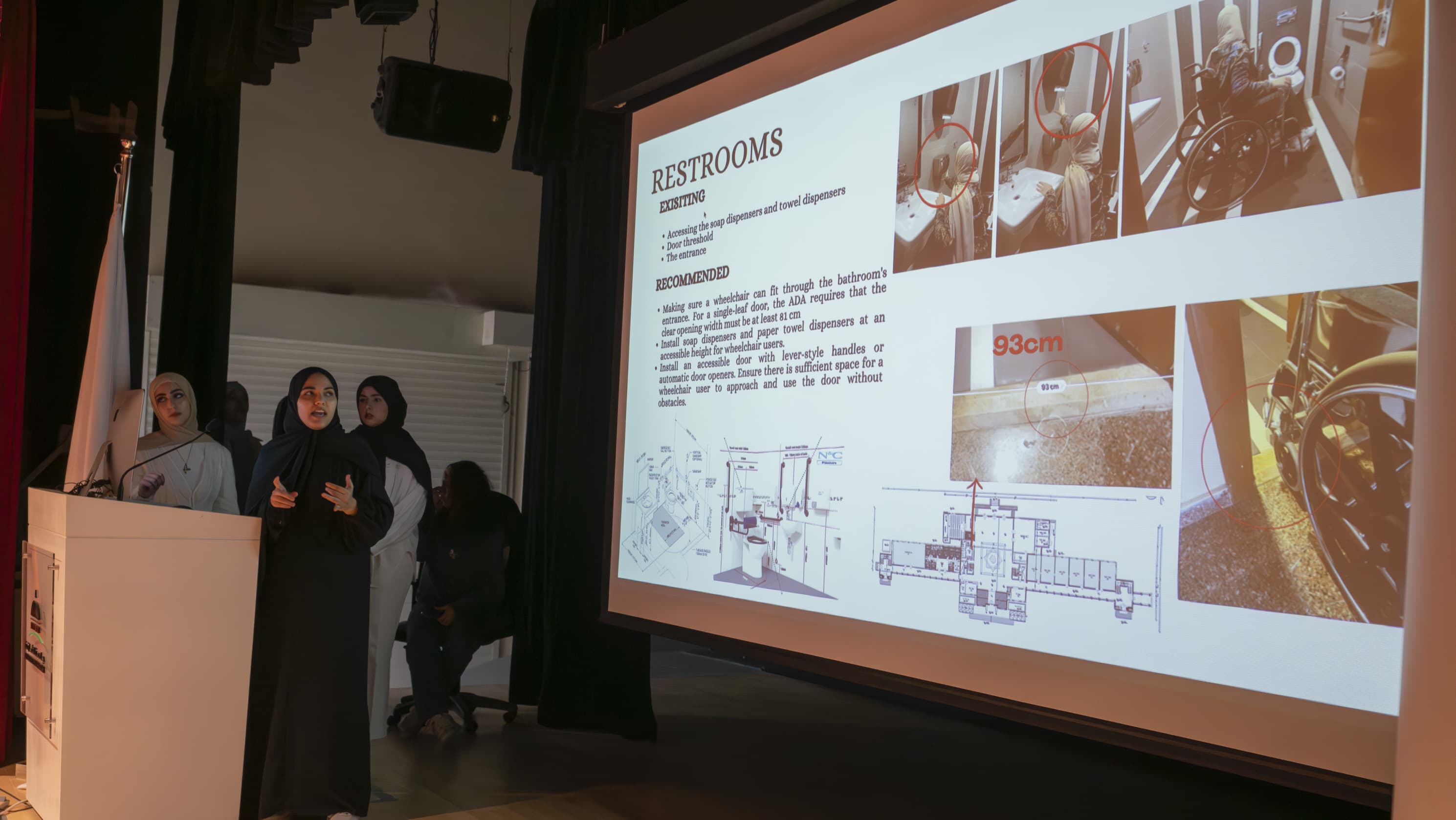The College of Fine Arts and Design collaborated with the UoS Sustainability Office, through the Equality and Integrated Accessibility Sustainability Circle, to audit three buildings on the main campus regarding its universal design appropriateness. The finalists included seventeen students divided into three teams who worked over a month as part of the “Building Systems for Interiors” Course under the supervision of Dr. Iman Ibrahim (Assistant Professor in Interior Design) and Ms. Hadil El Ankouni (Lecturer in Interior Design). Findings and solutions were presented to Mr. Haidar Abu Taleb (World Disability Union), Professor Imad Alsyouf (Director of the UoS Sustainability Office), and Ms. Fatima Almuaini (Leader of Equality and Integrated Accessibility Circle) who provided valuable feedback to students. This project continues the College’s efforts to introduce students to actual projects in support of community engagement.