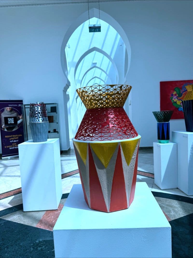 RAMADAN KAREEM is CFAD's latest exhibit of creative highlighting faculty's and students' contributions in celebration of the Holy month of Ramadan. The exhibit's sculptural pieces are colorful lantern-like objects each representing one or more nationalities calling the city Sharjah home. The concept is based on an actual population census, and delves into how Islamic patterns have evolved, showing their flexibility and endurance in an ever-changing world. Each of the nine pieces has its own story to tell. The uniqueness of the artwork stems from its eco-friendly mixed materials, like clay and recycled plastic filament, used in new ways brought to life through 3D printing. This choice of material is a nod to how sustainability and technology could work together in service of the future of art and design. The project is part of the collaborative research conducted by Dr. Iman Ibrahim (Associate Professor in Interior Design) and Dr. Karima Alshomely (Assistant Professor in Fine Arts). It was first exhibited at the Sharjah Museum of Islamic Civilization before moving to campus.