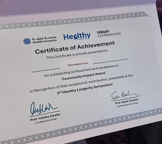 Supervised by Dr. Mona Hashim from the Clinical Nutrition and Dietetics (CND) department, graduates from the CND Department at the University of Sharjah were honored with a Community Impact Award at the Khalifa University Symposium for their outstanding contribution to public health awareness. As part of the 3rd Healthy Longevity Symposium held at Khalifa University in Abu Dhabi, the graduates presented a research poster titled “A study of the relationship between adherence to the MIND diet and neurocognitive status among older adults in Sharjah – cross-sectional.” Their project examined how adherence to the MIND dietary pattern relates to cognitive performance in aging populations. The study emphasized the importance of nutrition in promoting healthy longevity, and their work was commended for its scientific rigor, relevance to community health, and meaningful contribution to advancing research on cognitive well-being among older adults.