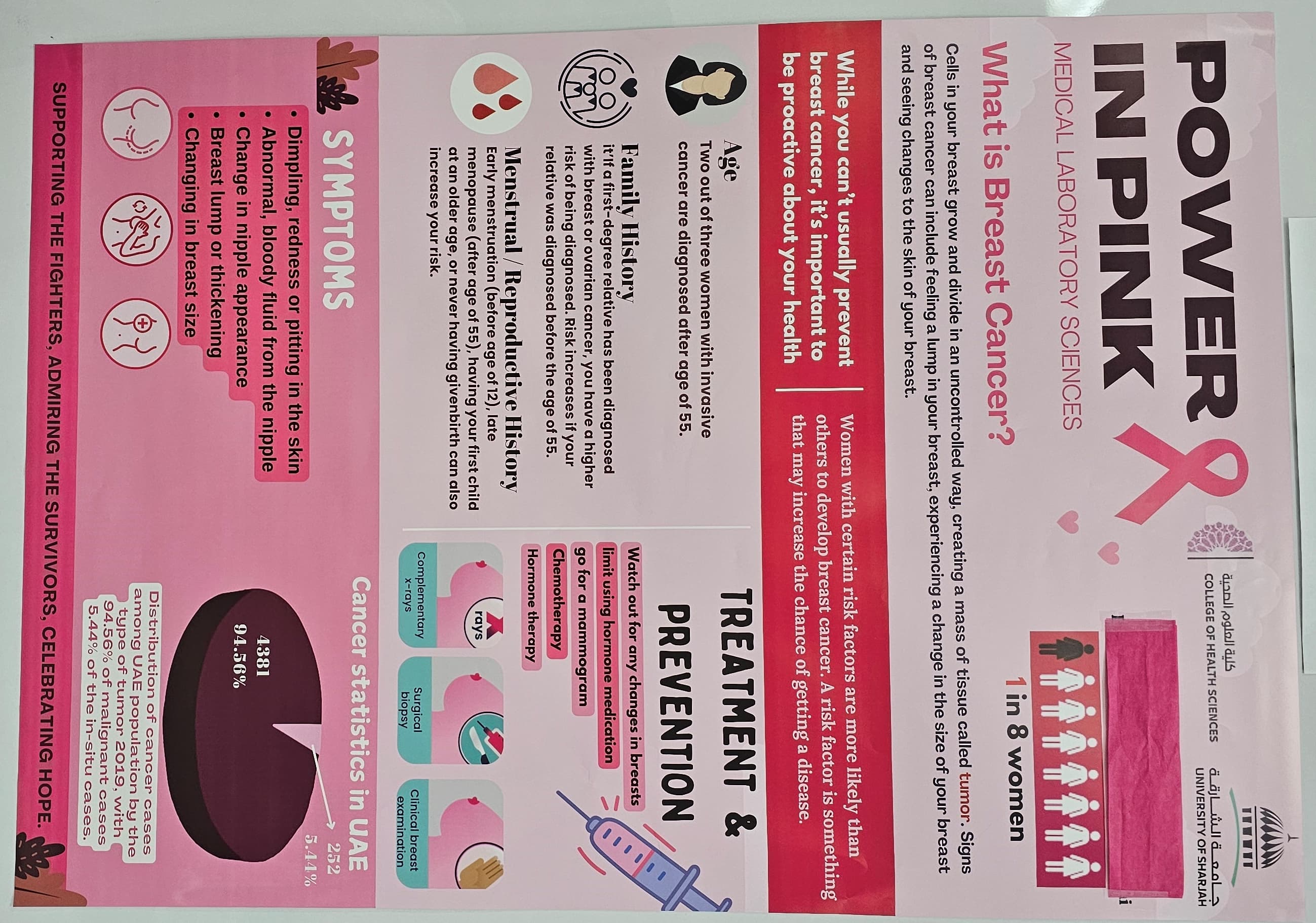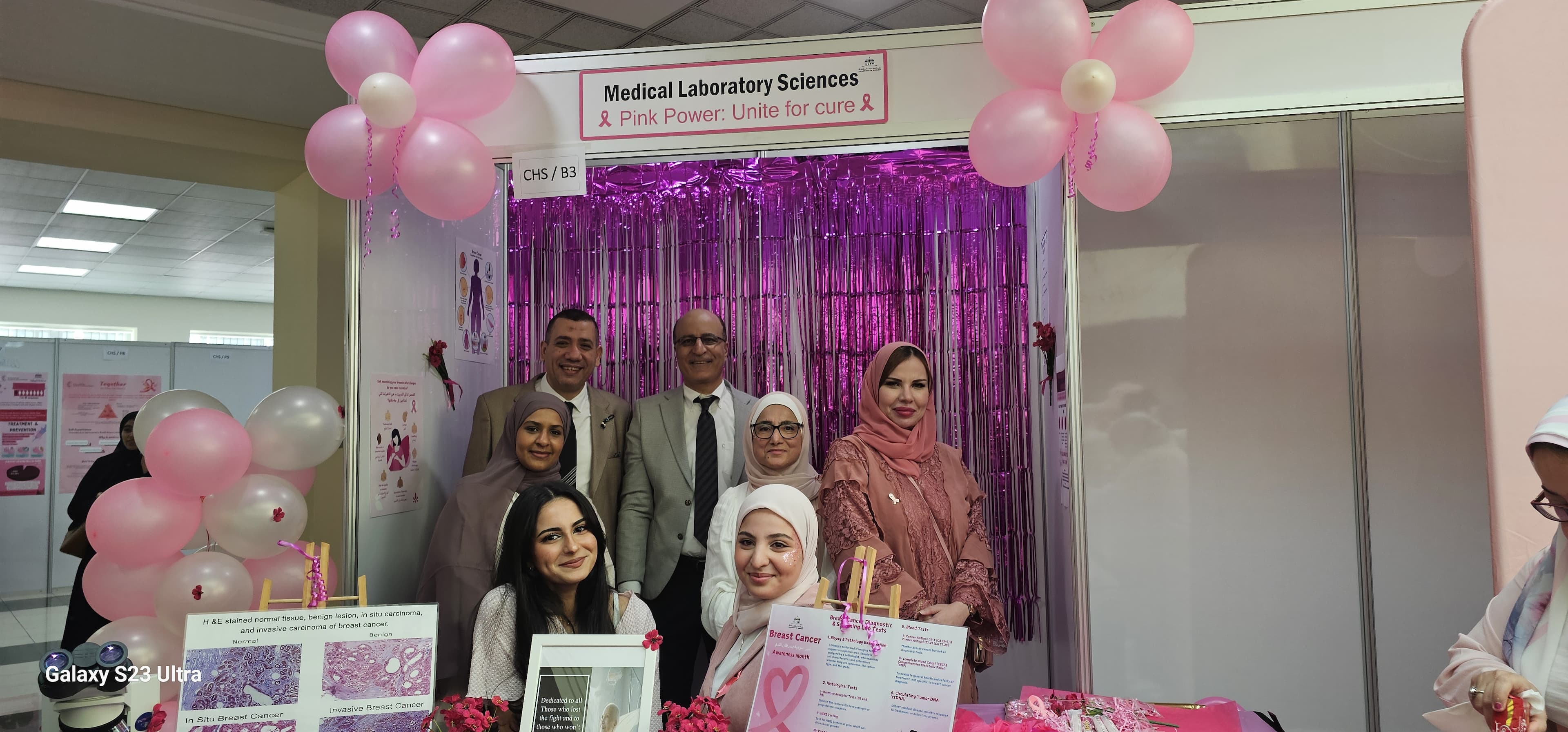Medical Laboratory Sciences students actively participated by creating the " Power In Pink" awareness poster. Additionally, the students showcased educational slides illustrating both normal and abnormal breast conditions, aimed to enhancing awareness among UOS students, faculty and public.