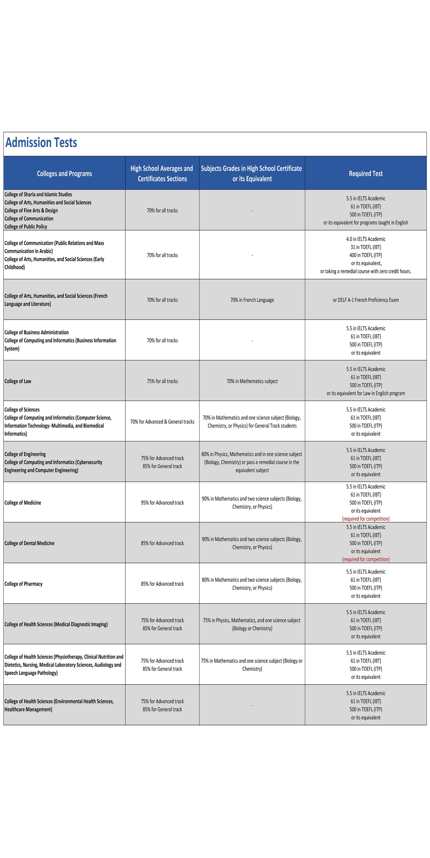 - Applicants must have received at least 70% in their final secondary school grades (Elite, Advanced, Scientific, General, or Applied tracks) to join the Colleges of Sharia and Islamic Studies; Arts, Humanities and Social Sciences; Public Policy; Business Administration; Fine Arts and Design; Communication; and the Computing and Informatics program (Business Information System).