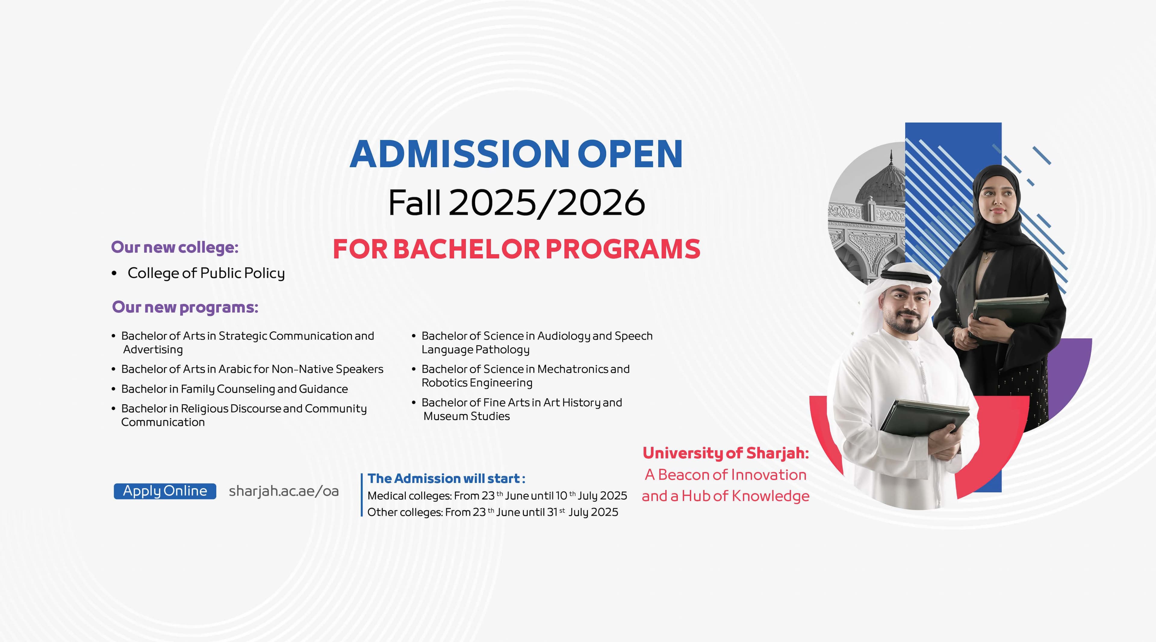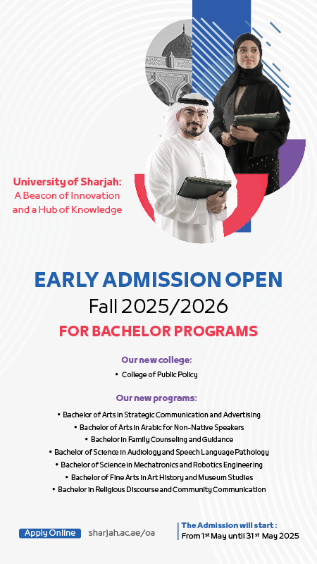 The University of Sharjah accepts students who are academically qualified and behaviorally distinguished, regardless of their nationality, color, religion, or disability.
