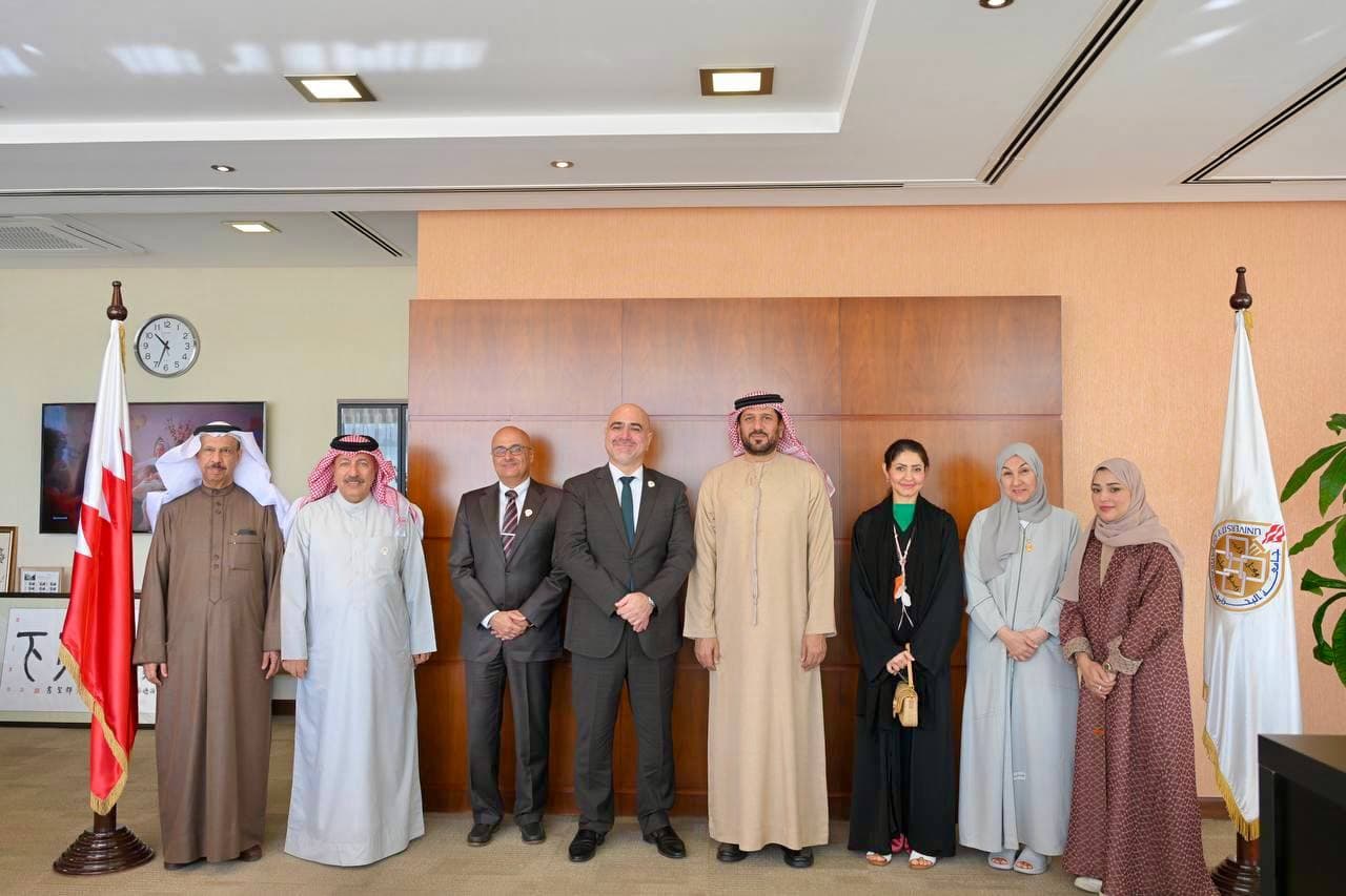 The visit began with a productive meeting at the University of Bahrain, where the delegation was welcomed by Prof. Fuad Mohammed Al-Ansari, President of the University, Dr. Osama Abdullah Al-Jowder, Vice President for IT Services and Administrative and Financial Affairs, Dr. Mohammed Saleh Al-Ansari, Vice President for Community Service and Alumni Affairs, and Dr. Mohammed Reza Qadir, Vice President for Academic Programs and Graduate Studies.