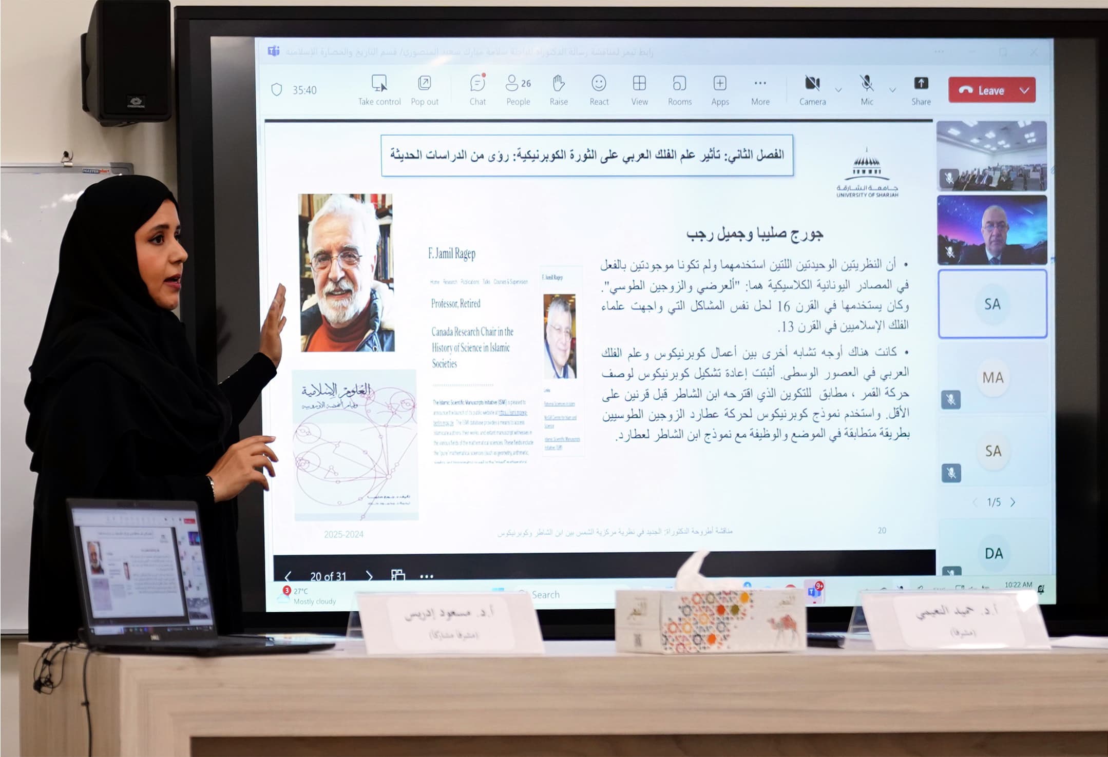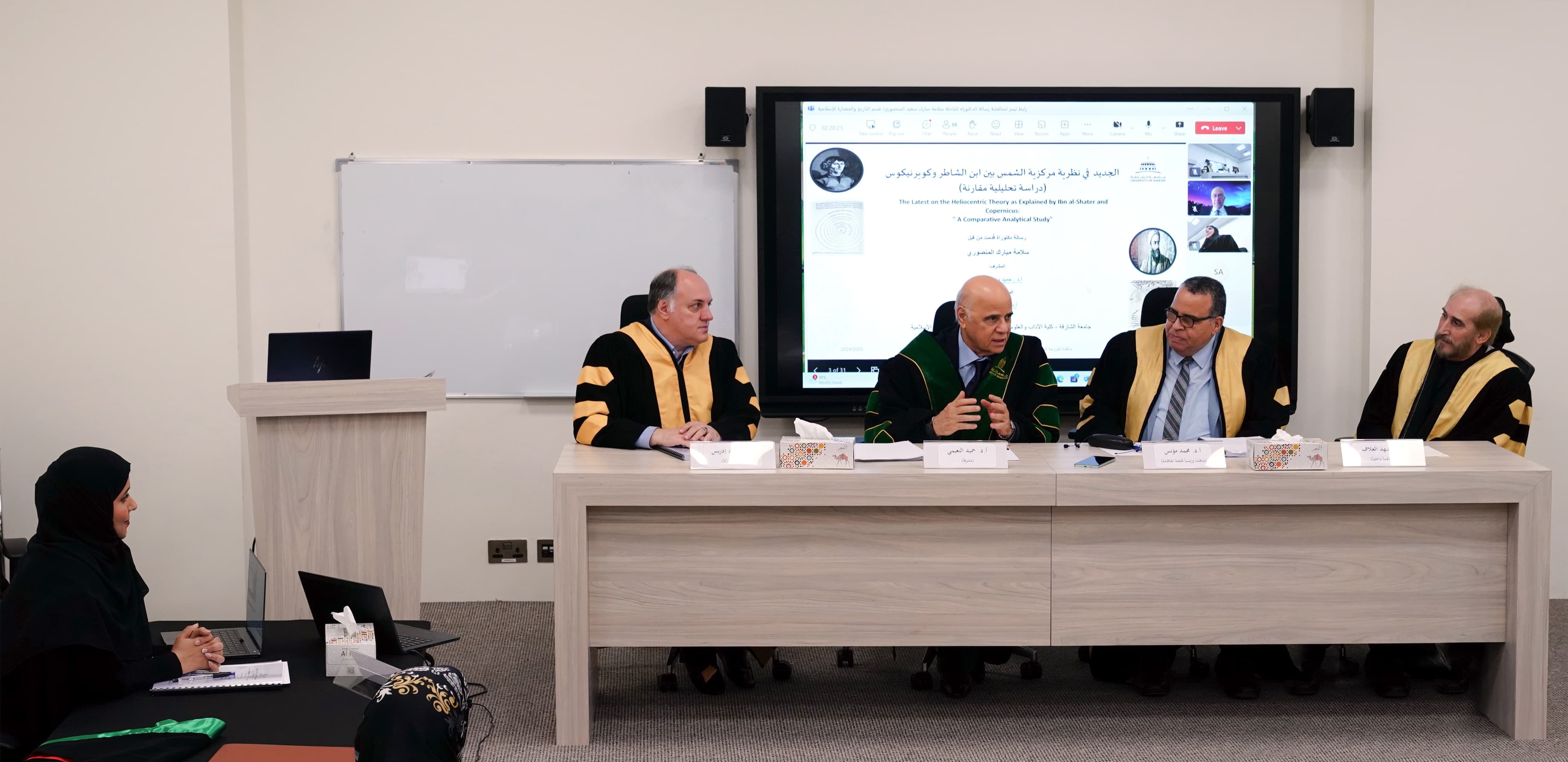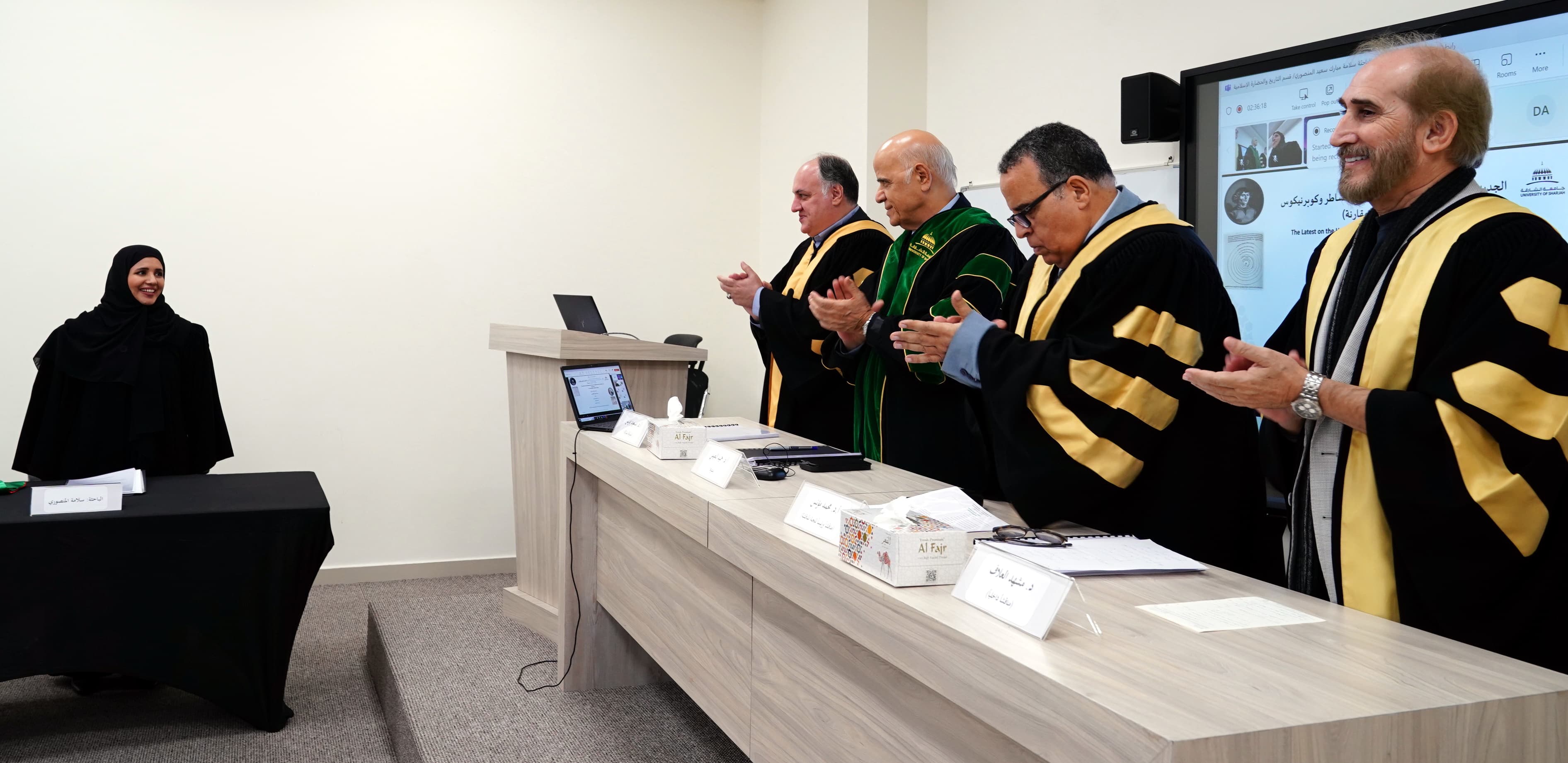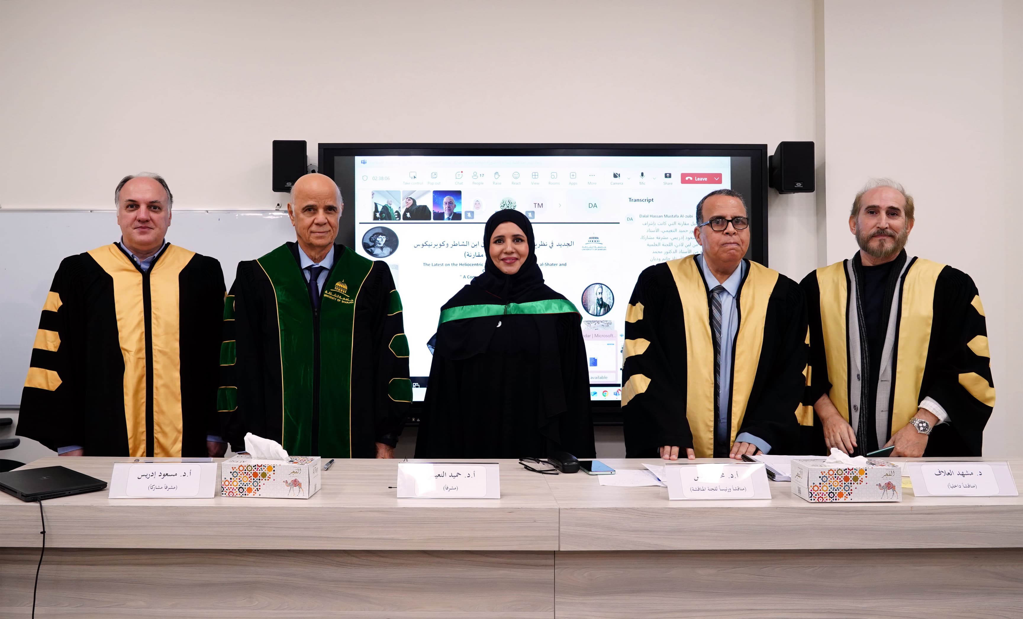 At the conclusion of the defense session, the examining committee unanimously recommended the acceptance of the dissertation, conferring upon the researcher a Doctorate in History and Islamic Civilization from the College of Arts, Humanities, and Social Sciences at the University of Sharjah. The committee commended the dissertation’s originality and its scholarly significance and its substantial contribution to historical and astronomical knowledge. The study provides fresh insights into the role of Muslim scholars in the evolution of astronomy and their critical contributions to the transmission of scientific knowledge to the West.