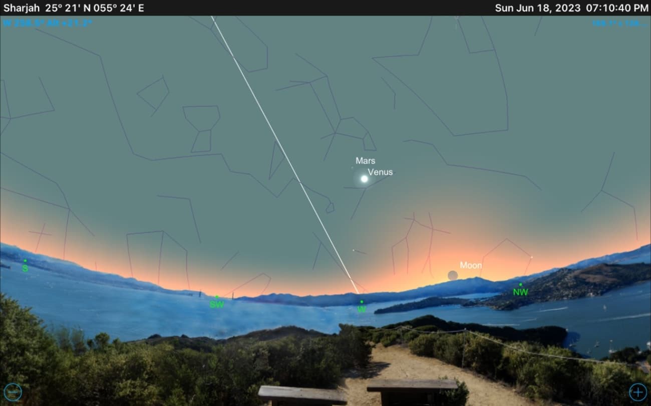A difficult setting for the crescent to be observed on Sunday, June 18, 2023 with the naked eye, but possible with a telescope if the sky conditions are perfect. The simulation shows the extremely low location of the Moon. We should expect the first day of Dhu’l Hijjah 1444 AH to be on Monday, 19 Jun, 2023.