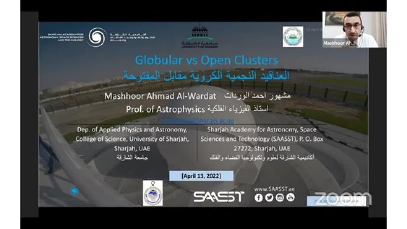 Prof. Mashhoor Al-Wardat, the Deputy General for Academics at the Sharjah Academy for Astronomy, Space Sciences, and Technology, gave an online lecture on Apr. 13, 2022, "Globular vs. Open Clusters." Star clusters come in different morphologies, sizes, and the number of stars in them. They are groups of hundreds to millions of stars that provide astronomers crucial insight into stellar evolution by comparing stars' ages and compositions. Star clusters form out of large interstellar regions of gas and dust called molecular clouds. The densest areas of those molecular clouds collapse into themselves to form stars. In some cases, the stars disperse after their creation. However, if enough stars are formed close together, they may remain gravitationally bound and live as a star cluster.