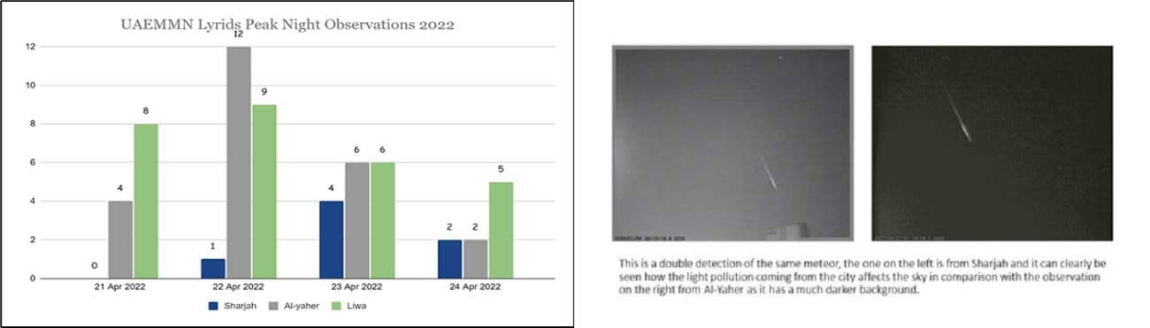 This number could have been higher, but unfortunately, we had a bright moon illuminating the night sky on those nights, resulting in a low detection rate from our three UAEMMN towers in Sharjah, Yahar, and Liwa. The Sharjah tower suffers from the constant city light pollution with a detection of only 5 meteors during the nights of April 22 and 23. On the other hand, Al-Yaher tower captured 18 meteors, and Liwa followed up very close with 15 meteors as these locations have the advantage of a darker night sky.