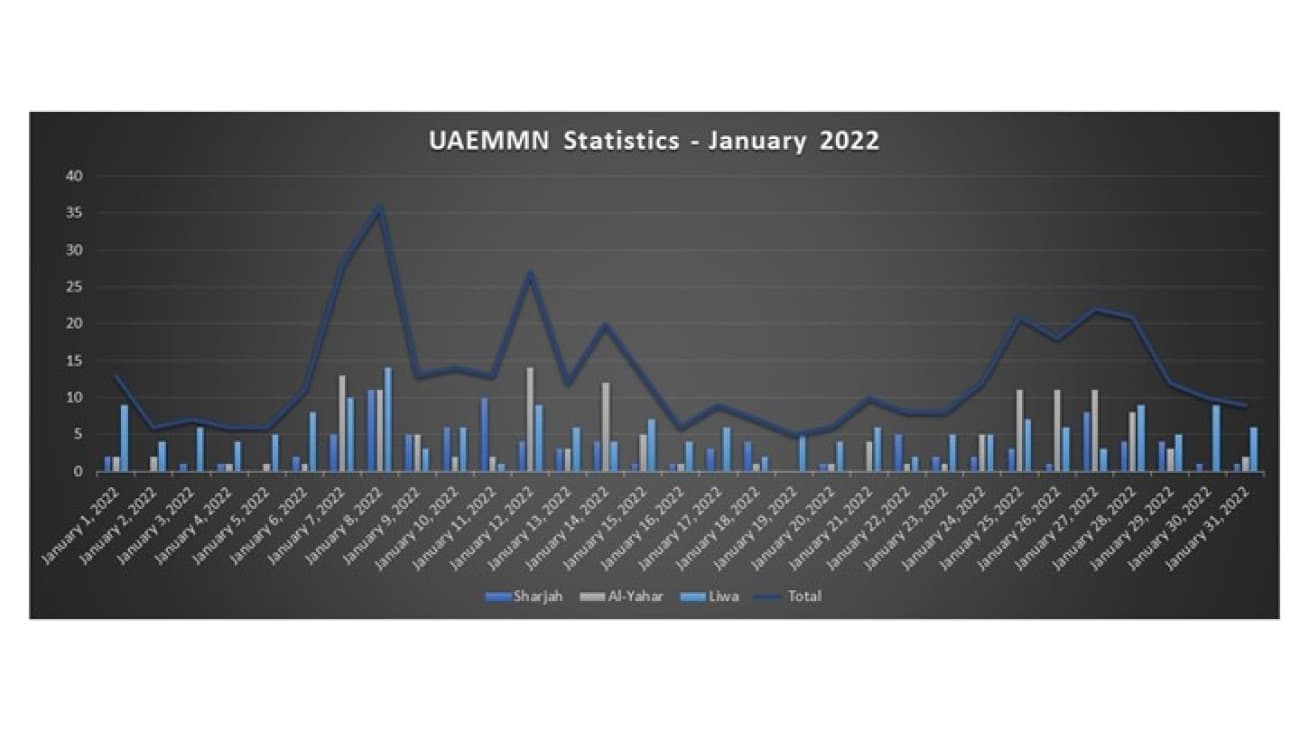 The UAE Meteor Monitoring Network (UAEMMN) consists of three towers (Sharjah, Yahar, and Liwa) dedicated to observing meteors over the UAE sky. It has been operational since 2018. For January 2022, the total number of meteors observed was as follows: Sharjah (95 meteors), Al-Yahar (134 meteors), and Liwa (180 meteors). This leads to a total of 409 meteors. The pattern of detections shows fluctuation throughout the month, peaking on January 8, as the total count reached 36 meteor detections.