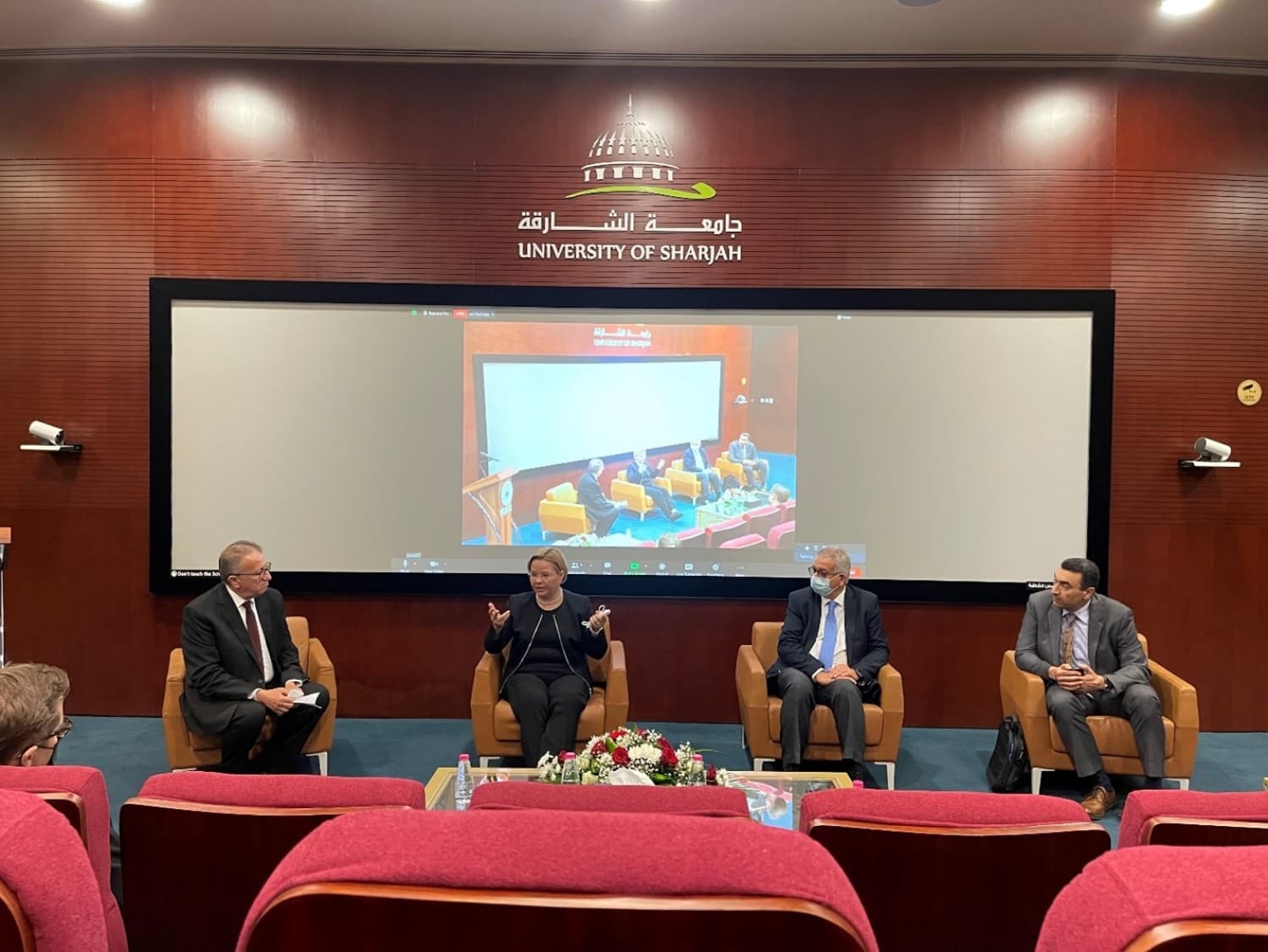 A panel discussion followed the lecture. Prof. Ahmed Al-Shamma, the Dean of the College of Engineering, and Prof. Mashhoor Wardat, the SAASSt Deputy General, participated in this panel with Prof. Ilias Fernini, SAASST Deputy General Director for Research, being the moderator. Questions were around “What makes a space sustainable?”, “What is an example of sustainable use?”, “Why is it important to think of solutions to make space sustainable?”, “What role can the space operators play to have a sustainable use of space?”, and other subjects.