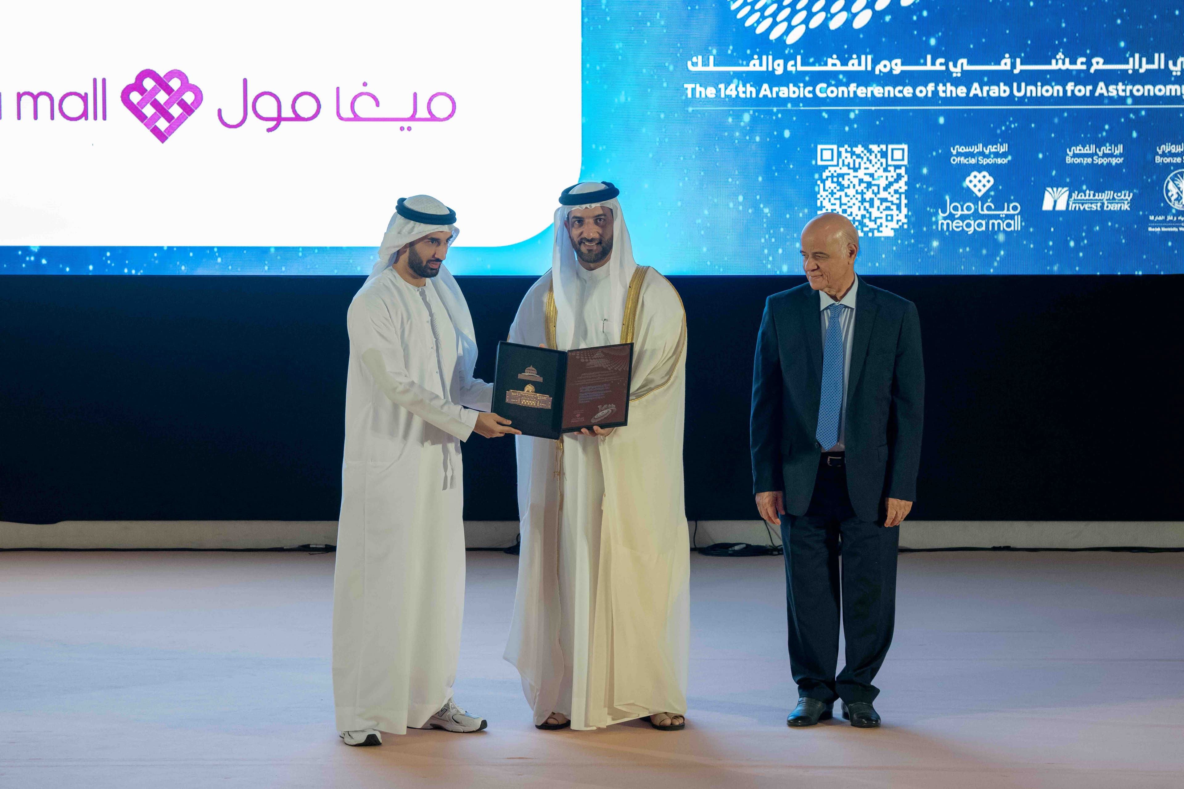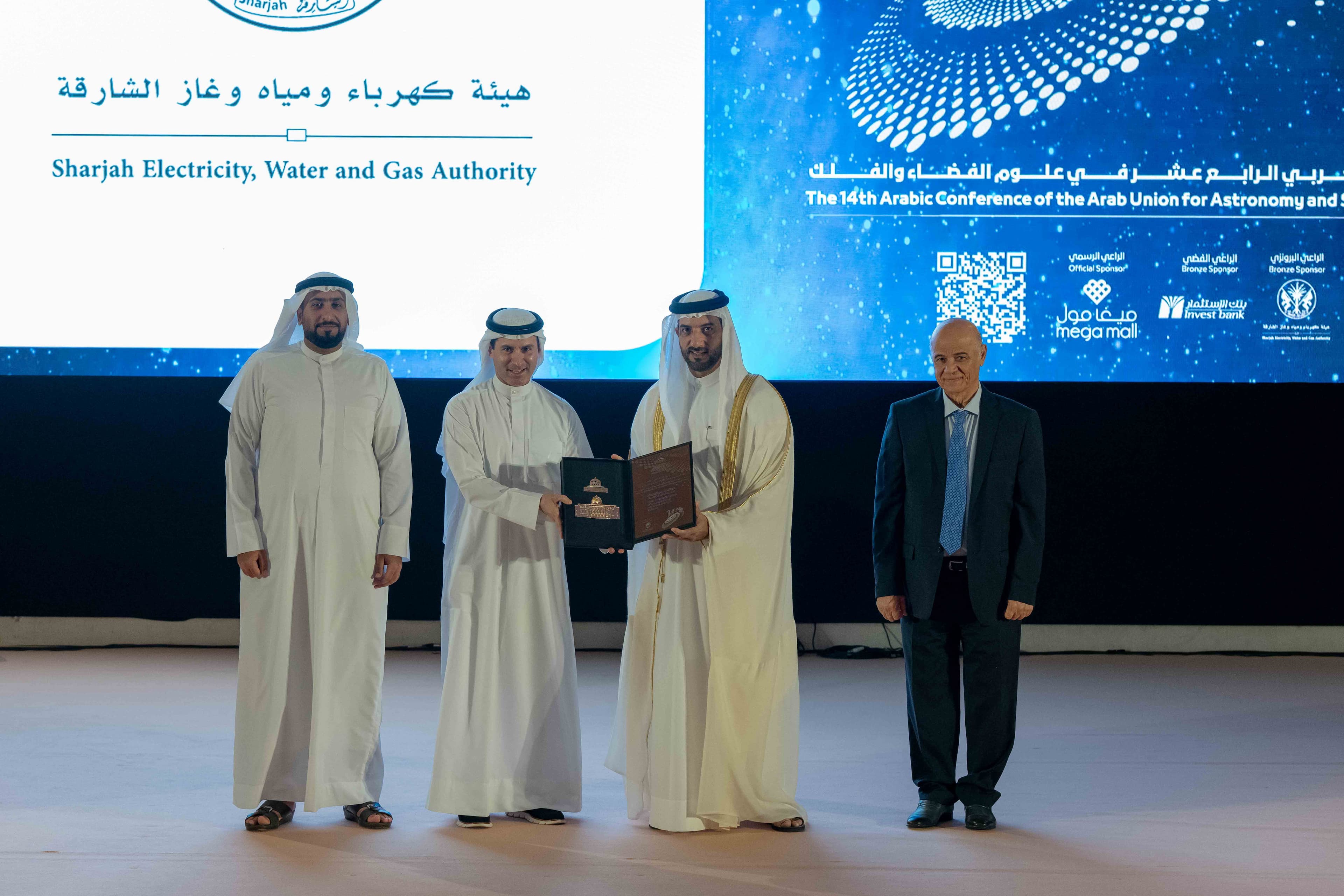 At the close of the opening ceremony, His Highness Sheikh Sultan bin Ahmed Al Qasimi, Deputy Ruler of Sharjah, and President of the University of Sharjah honored the partners and sponsors of the 14th Arab Conference on Space and Astronomy, presenting them with commemorative shields and posing for group photographs. He commended their support for the conference and their role in promoting scientific studies in the space and astronomy sector.