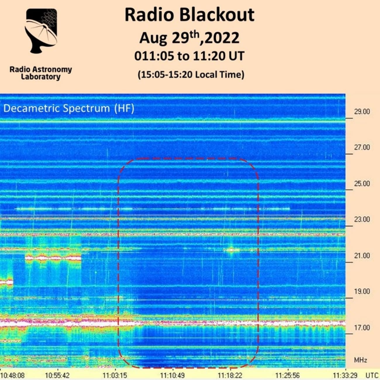 The Low-Frequency Radio Telescope at SAASST detected a sudden ionospheric disturbance from 11:05-11:20 (15:05-15:20 local time) on Aug. 29, 2022. This radio blackout affected frequencies below 21 MHz.