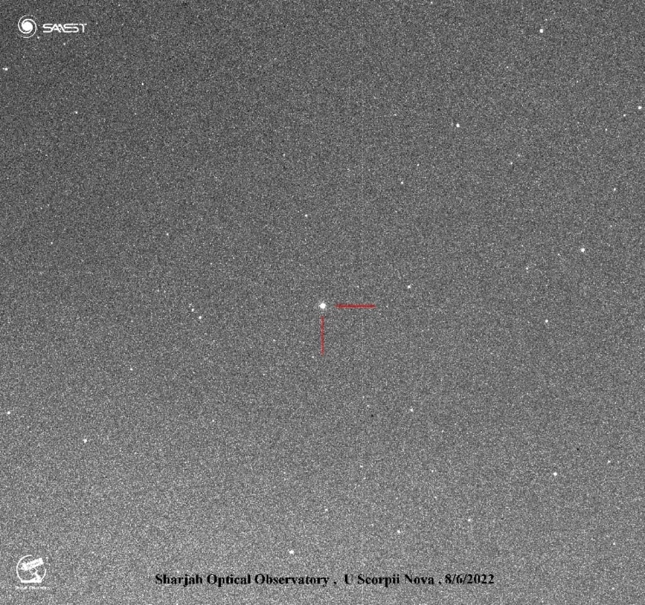 This is a picture of the U Scorpii (U Sco), a recurrent nova system in the constellation of Scorpius. Mr. Mohamed Talafha took the picture at the SAASST Sharjah Optical Observatory on June 08, 2022. U Scorpii is known to be one of the ten known recurrent novae in our own Milky Way galaxy. The American Association of Variable Star Observers (AAVSO) is currently running an observing campaign on U Sco, and worldwide observers are encouraged to observe this star as often as possible.