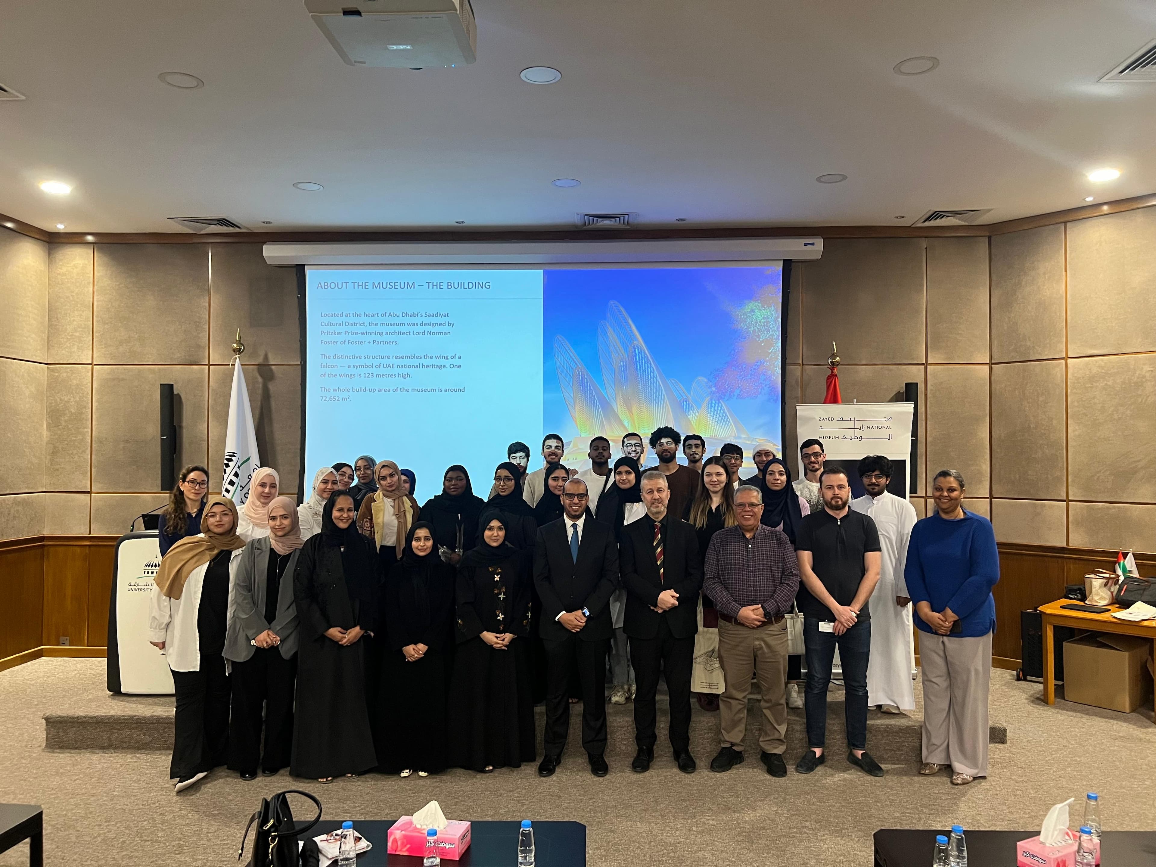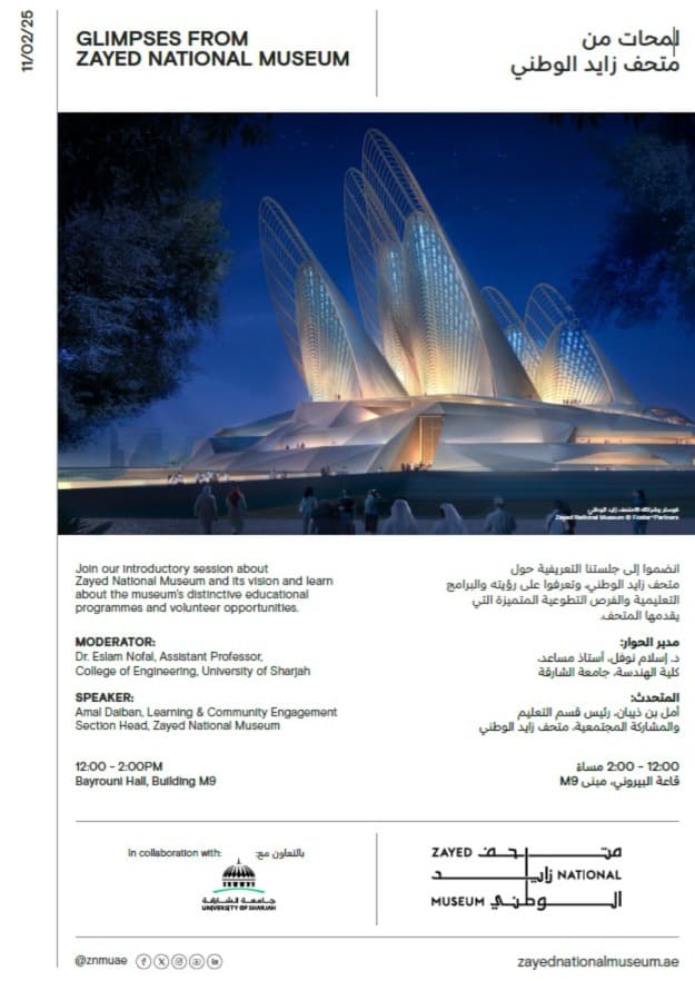 استضاف قسم الهندسة المعمارية بجامعة الشارقة يوم 11 فبراير 2025 جلسة تعريفية بعنوان "لمحات من متحف زايد الوطني"، حيث قدم فريق المتحف لمحة عن رؤية المتحف، برامجه التعليمية، وفرص التطوع فيه. خلال الجلسة، تم استعراض برنامج المتطوعين وبرنامج السفراء والمنح البحثية السنوية التي يقدمها المتحف لدعم الباحثين في مجال التراث. كما تم توزيع هدايا تذكارية للحضور تقديراً لمشاركتهم.