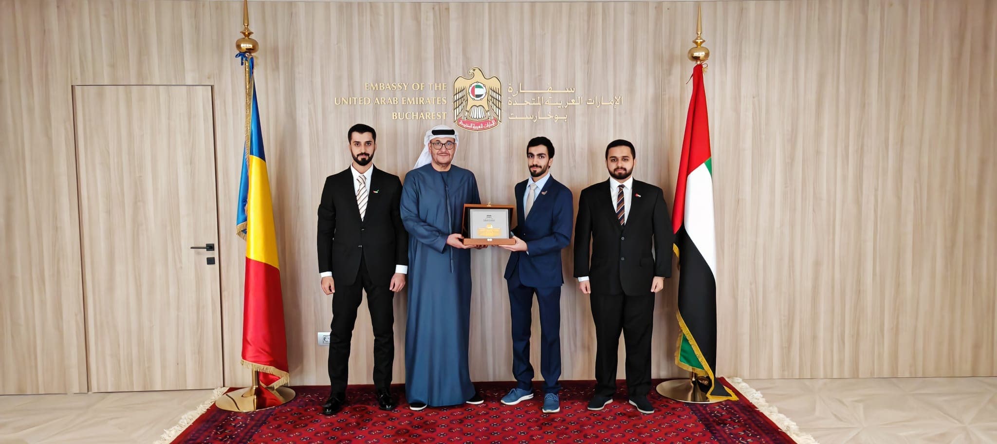 وقد حظي الوفد بالترحيب والدعم من قِبل طاقم سفارة دولة الإمارات العربية المتحدة في رومانيا، كما تشرفوا بلقاء سعادة السفير سلطان محمد العلي، سفير دولة الإمارات لدى رومانيا، في مقر السفارة، حيث أعرب عن دعمه للطلبة ولمسيرتهم الأكاديمية.