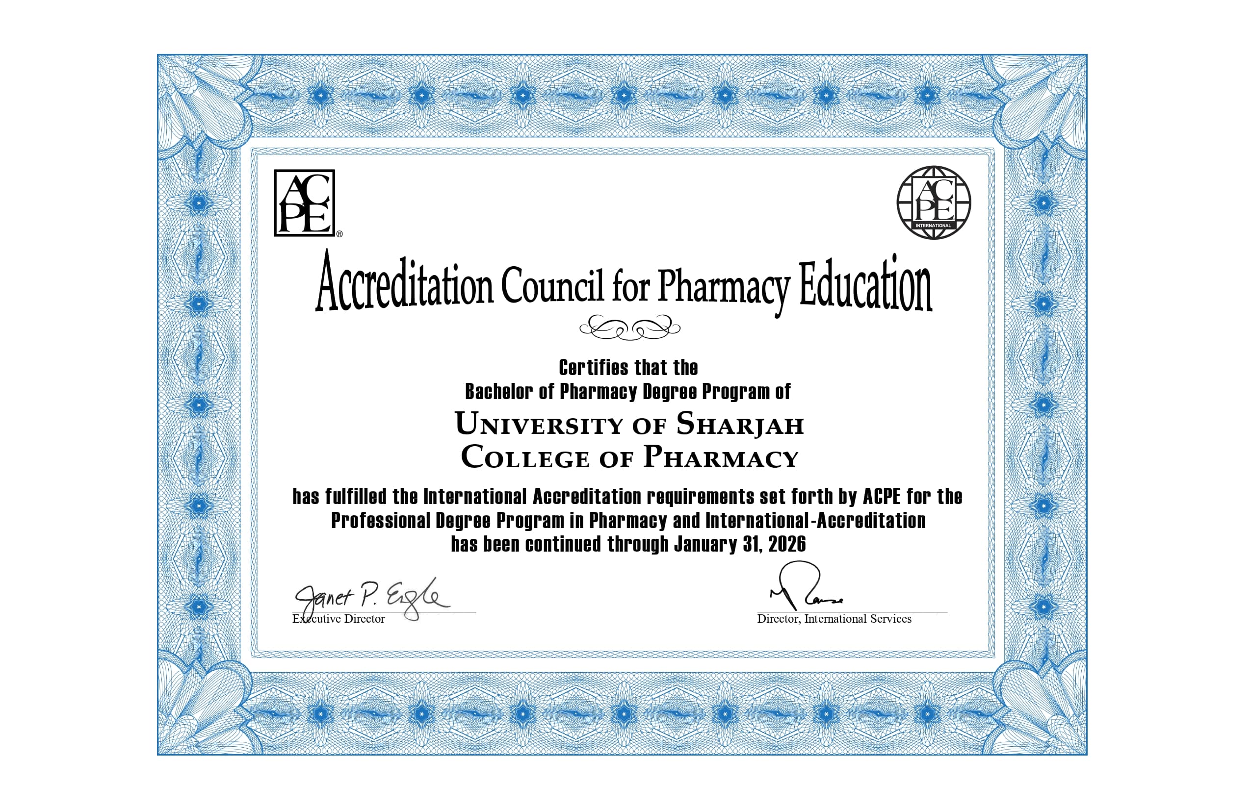 تفخر كلية الصيدلة بإعلان أن برنامج درجة دكتور الصيدلة (PharmD) قد حصل على اعتماد ACPE الدولي في يناير 2024. يُعد هذا الإنجاز شهادة على الجهود الكبيرة والتفاني من قبل هيئة التدريس والموظفين والطلاب، ونحن فخورون جداً بذلك.