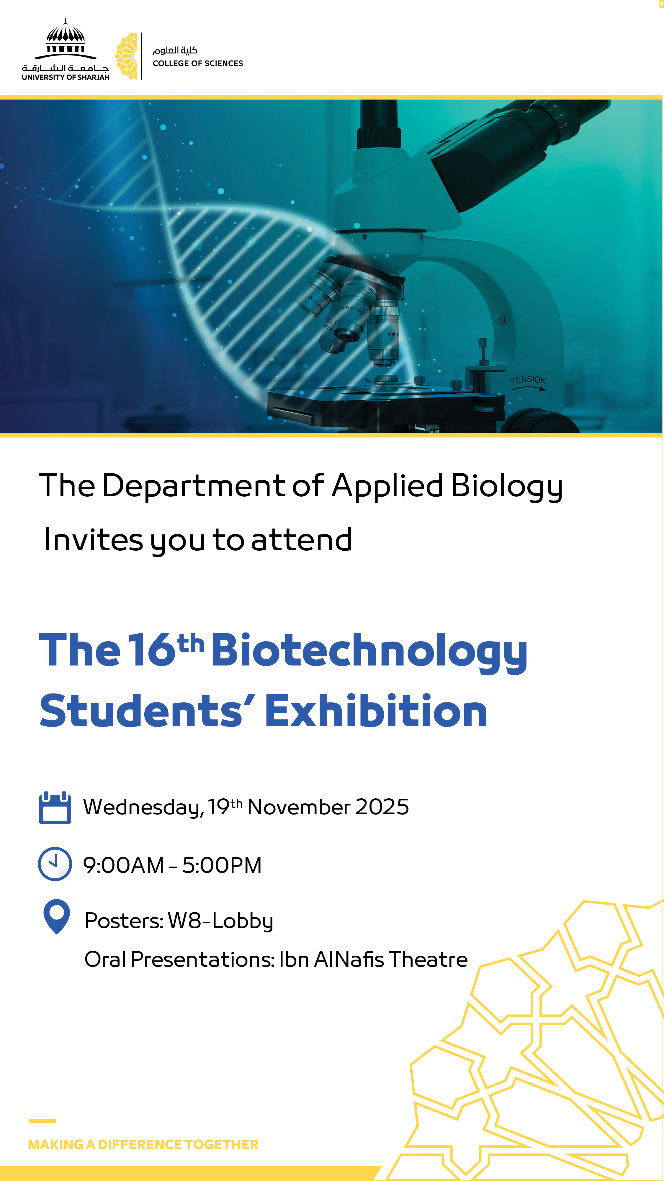 نجح قسم الأحياء التطبيقية في تنظيم المعرض السادس عشر لطلبة التكنولوجيا الحيوية، والذي استعرض أعمال أكثر من 300 طالب وطالبة من السنة الثانية والثالثة والرابعة. تضمّن المعرض 22 عرضًا شفهيًا و34 عرضًا ملصقيًا تناولت مجموعة واسعة من موضوعات التكنولوجيا الحيوية. وقد أبرز المعرض مهارات الطلبة العلمية، وإبداعهم، وقدراتهم البحثية، كما وفر منصة تفاعلية مميزة للتواصل مع أعضاء الهيئة التدريسية والزوار..