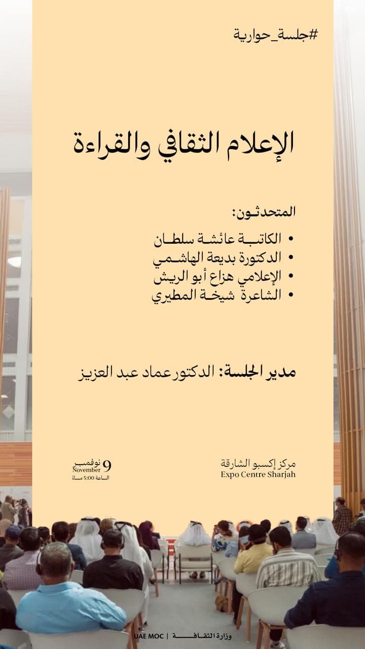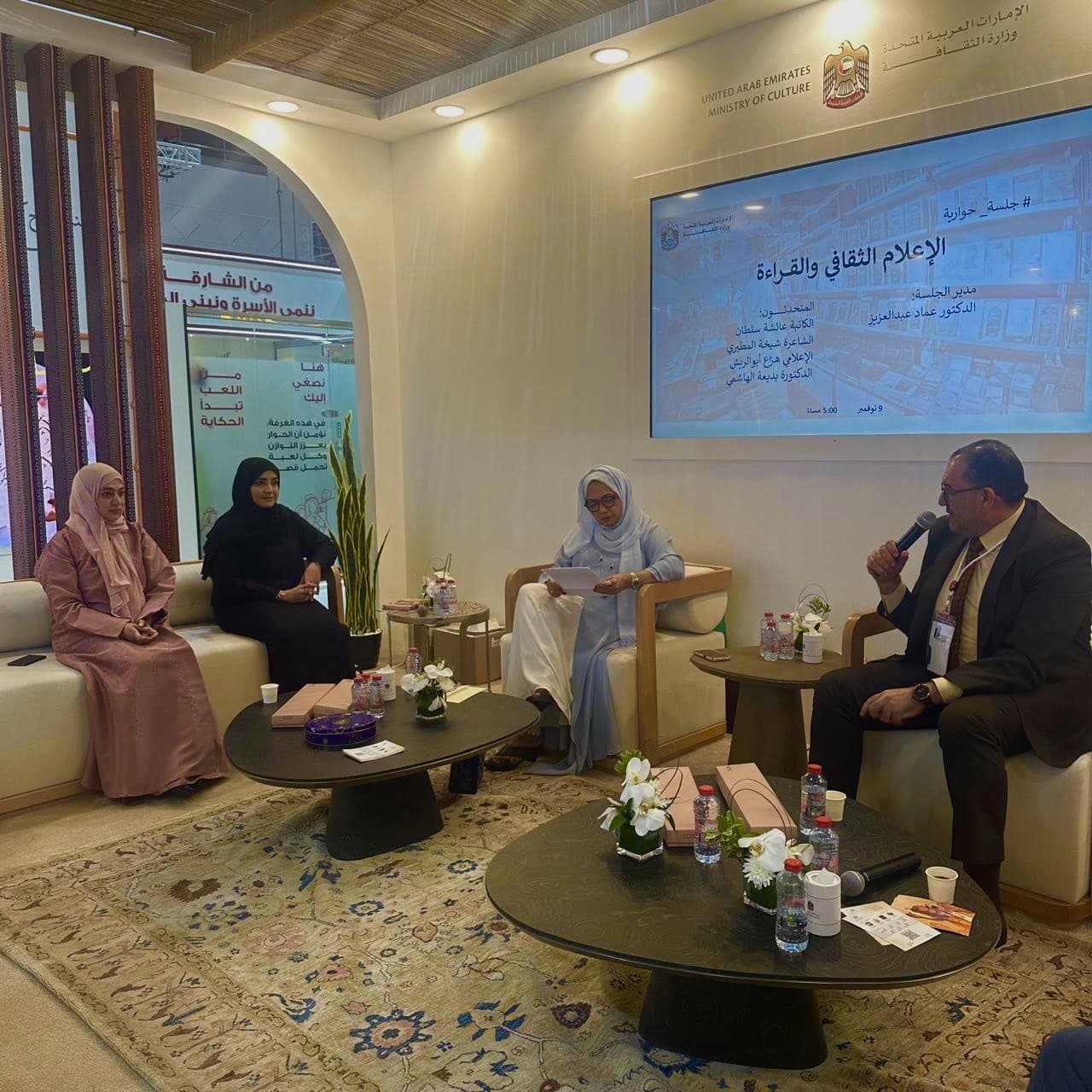 شاركت د.بديعة الهاشمي، أستاذ مشارك ورئيس قسم اللغة العربية وآدابها، بتاريخ: 9/ 11/ 2025 في جلسة حوارية، تحت عنوان: "الإعلام الثقافي والقراءة"، نظمتها وزارة الثقافة، في جناحها ضمن فعاليات معرض الشارقة الدولي للكتاب 2025، في دورته 44.