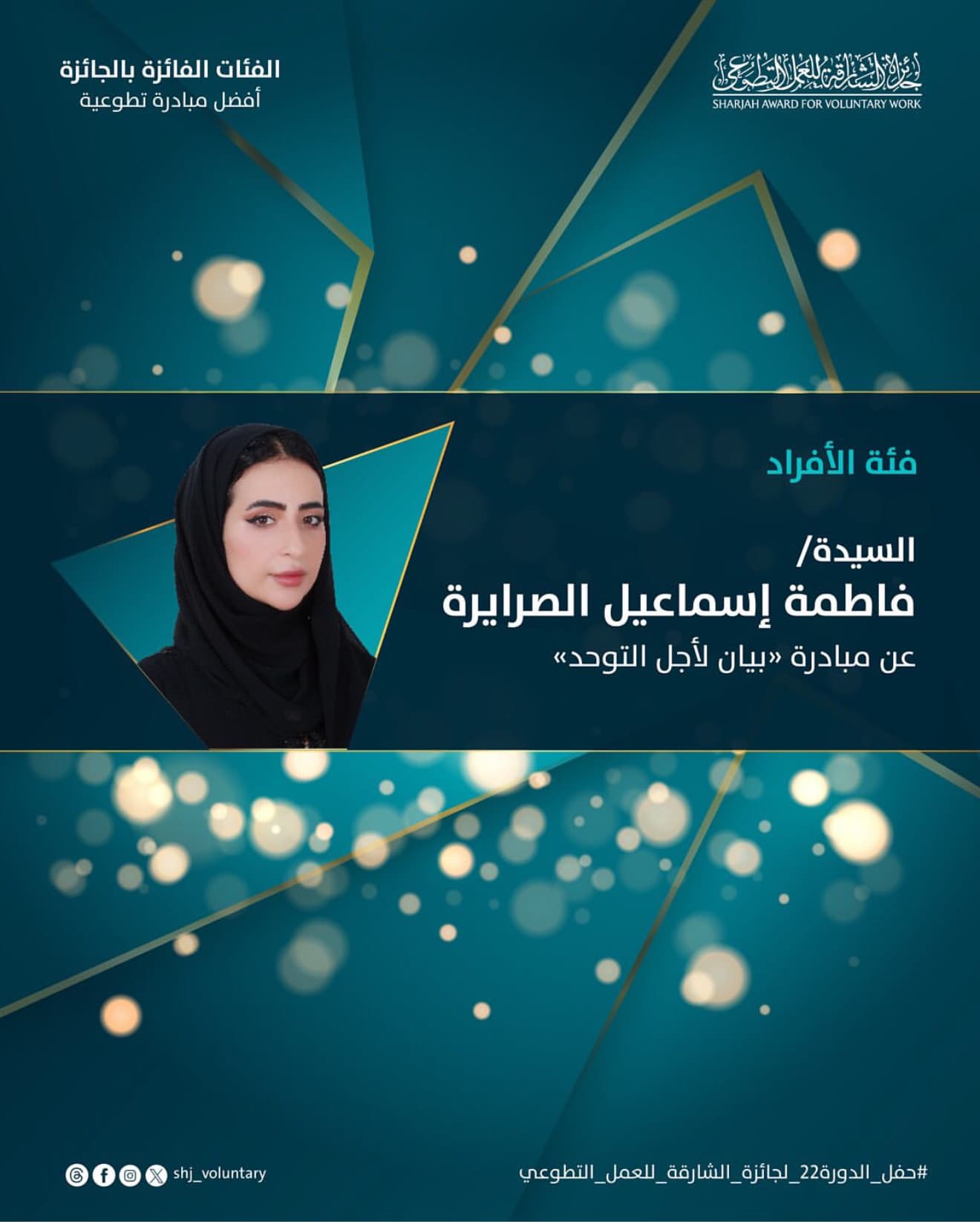 في إنجاز إنساني ومجتمعي مميز، فازت الطالبة فاطمة إسماعيل الصرايرة بجائزة الشارقة للعمل التطوعي في دورتها الثانية والعشرين، عن فئة الأفراد المبادرين، وذلك تقديرًا لمبادراتها التطوعية النوعية التي استهدفت دعم أمهات الأطفال من ذوي اضطراب طيف التوحد.