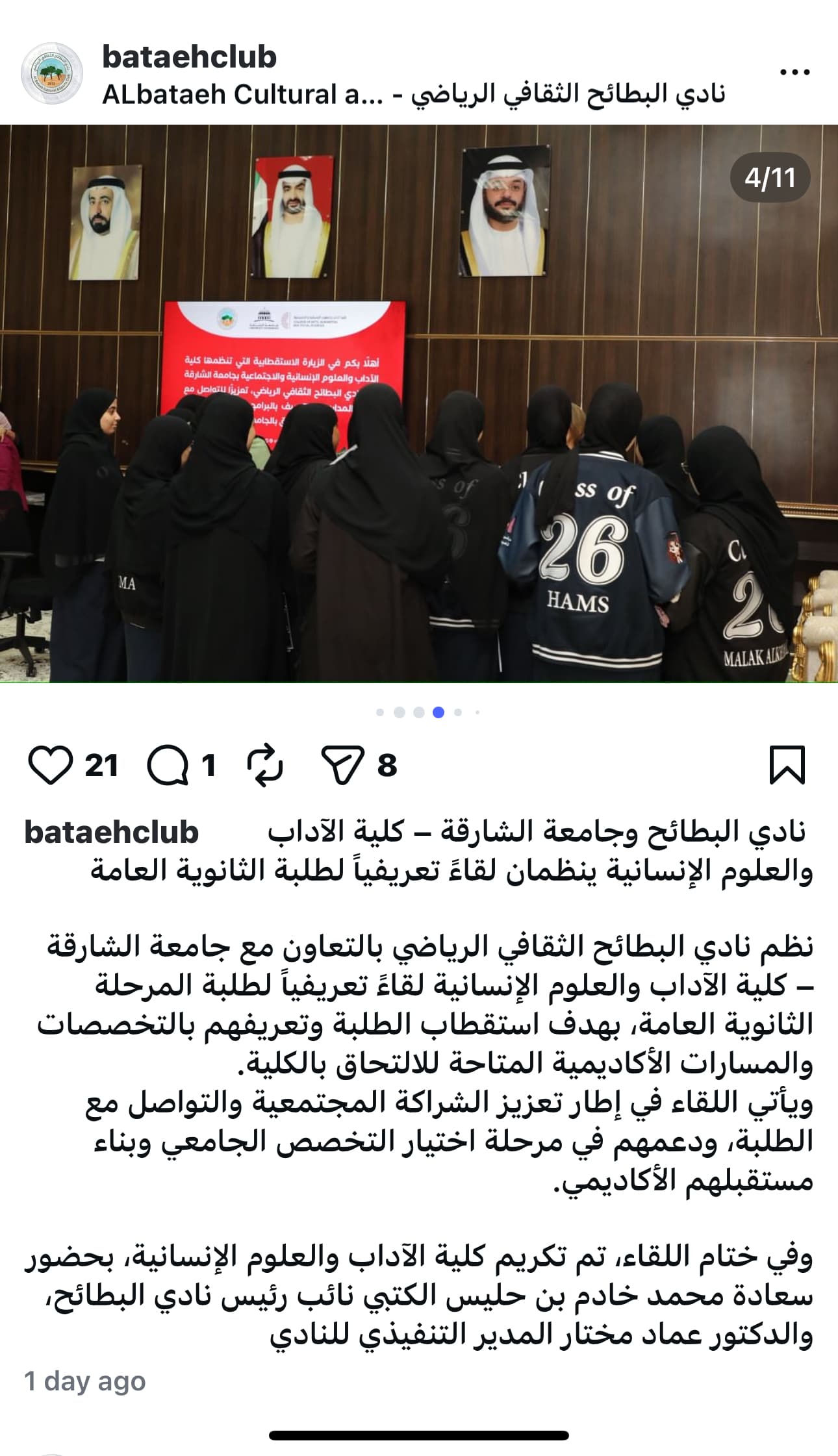 نادي البطائح وجامعة الشارقة - كلية الآداب والعلوم الإنسانية والإجتماعية ينظمان لقاءً تعريفياً لطلبة الثانوية العامة