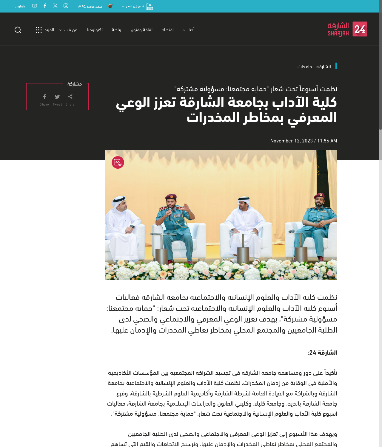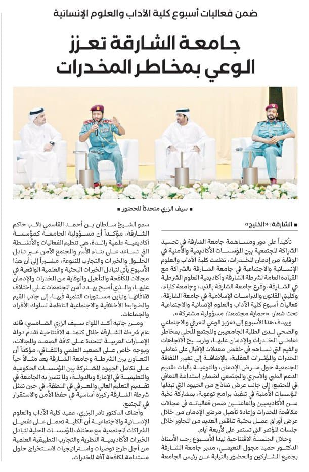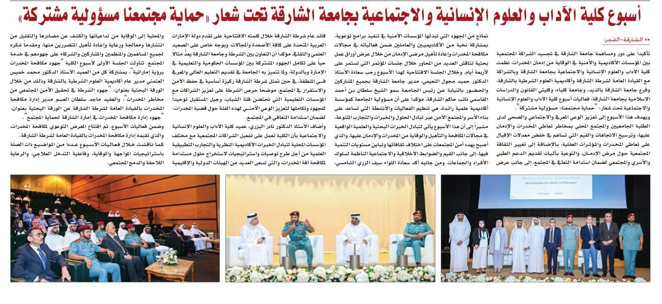 نبذة عن الأسبوع: في ظل التحولات الدولية التي يشهدها العالم في مجال الإجرام المنظّم، شهدت جرائم المخدرات امتدادًا واسعًا على المستويين الدولي والإقليمي، مما شكّل خطرًا حقيقيًا على أمن واستقرار الدول والحكومات، نظرًا لاستخدام أساليب إجرامية متطورة تعتمد على التقنية العالية في بيئة تكنولوجيا المعلومات. وقد فرض هذا الواقع على الدول تفعيل أجهزتها الأمنية المعنية بمكافحة جرائم المخدرات، بما يمكّنها من مواجهة هذا الخطر وتنفيذ السياسات الوقائية والعلاجية المناسبة. وفي هذا السياق، وتحت شعار "حماية مجتمعنا: مسؤولية مشتركة"، تنظم كلية الآداب والعلوم الإنسانية والاجتماعية، بالشراكة مع القيادة العامة لشرطة الشارقة، وأكاديمية العلوم الشرطية بالشارقة، وجامعة الشارقة فرع الذيد، وكلية القانون، وكلية الشريعة والدراسات الإسلامية، "أسبوع كلية الآداب للوقاية المجتمعية"، الذي يهدف إلى تعزيز الوعي المعرفي والاجتماعي والصحي بمخاطر تعاطي المخدرات والإدمان عليها، وترسيخ الاتجاهات والقيم التي تسهم في خفض معدلات الإقبال على تعاطي المخدرات والمؤثرات العقلية، لا سيما بين الشباب، فضلًا عن تغيير الثقافة المجتمعية حول مرض الإدمان، والتوعية بآليات تقديم الدعم الطبي والأسري والمجتمعي لضمان استدامة التعافي في المجتمع. ويأتي تنظيم هذا الأسبوع المهم تجسيدًا للشراكة المجتمعية بين المؤسسات الأكاديمية والأمنية في تنفيذ سياسة التدخل المبكر لخفض الطلب على المواد المخدرة، والكشف المبكر عن حالات التعاطي قبل تطورها إلى مرض الإدمان، والتوعية بالخدمات العلاجية ذات الكفاءة العالية التي توفرها دولة الإمارات العربية المتحدة، وآليات إعادة دمج المرضى المتعافين في المجتمع من خلال خدمات الرعاية اللاحقة المتاحة لهم. أهداف الأسبوع: