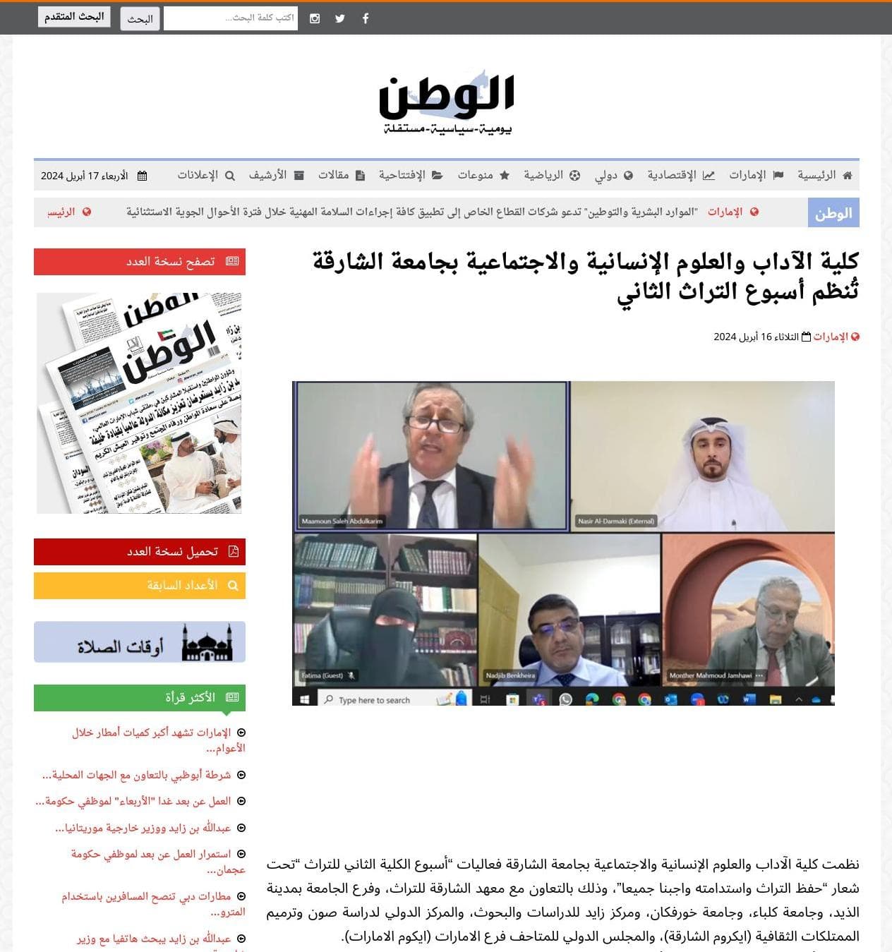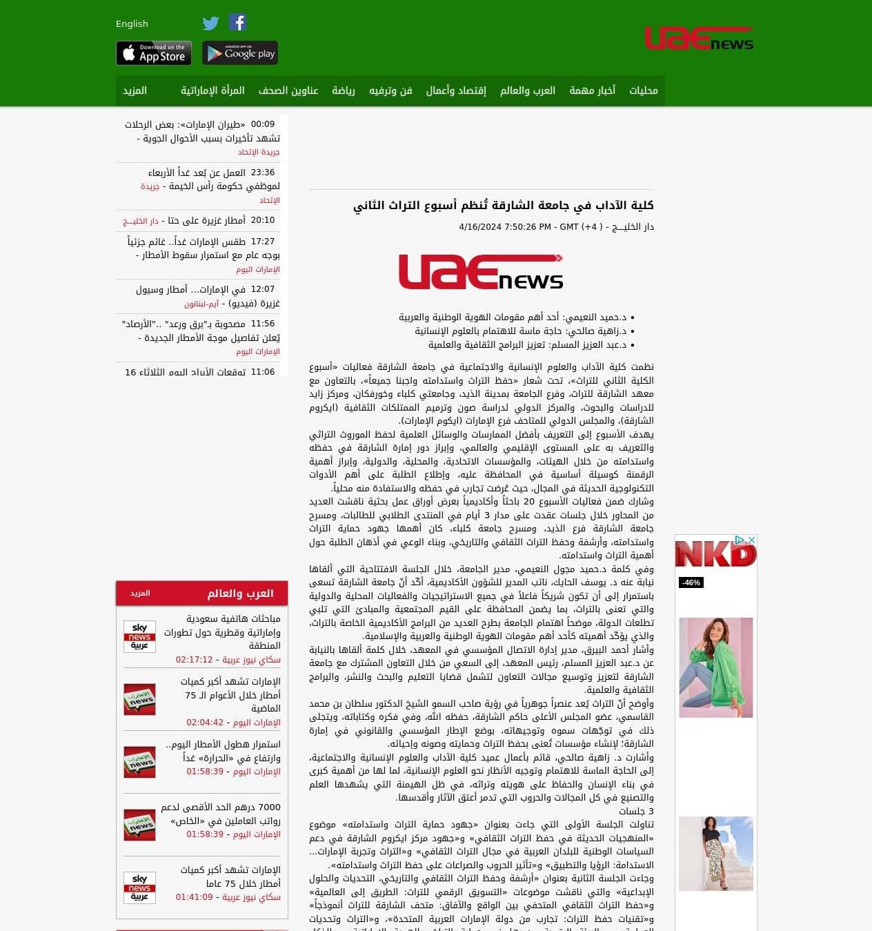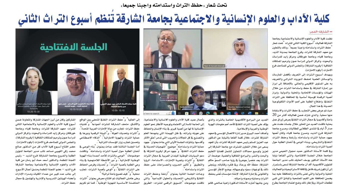 نظّمت كلية الآداب والعلوم الإنسانية والاجتماعية بجامعة الشارقة فعاليات "أسبوع الكلية الثاني للتراث" تحت شعار "حفظ التراث واستدامته واجبنا جميعًا"، وذلك بالتعاون مع معهد الشارقة للتراث، وفرع الجامعة بمدينة الذيد، وجامعة كلباء، وجامعة خورفكان، ومركز زايد للدراسات والبحوث، والمركز الدولي لدراسة صون وترميم الممتلكات الثقافية (إيكروم الشارقة)، والمجلس الدولي للمتاحف فرع الإمارات (إيكوم الإمارات).