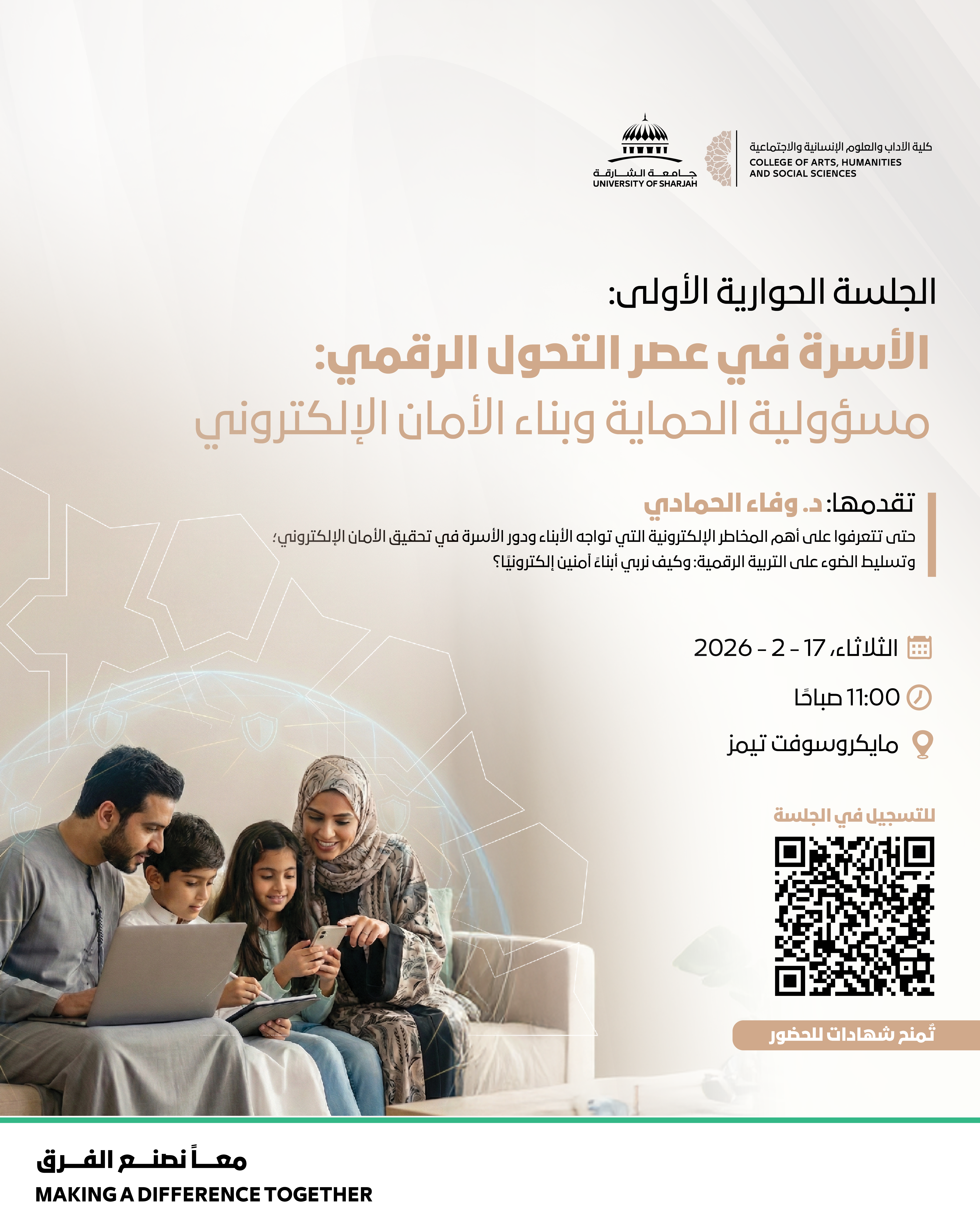 ضمن مبادرة أمانُك الرقمي، خط دفاعك الأول تدعوكم كلية الآداب والعلوم الإنسانية والاجتماعية لحضور الجلسة الحوارية الأولى بعنوان: " الأسرة في عصر التحول الرقمي: مسؤولية الحماية وبناء الأمان الإلكتروني" The Family in the Age of Digital Transformation: The Responsibility of Protection and Building Cybersecurity تقدمها: الدكتورة وفاء الحمادي، محاضر، قسم علم الاجتماع حتى تتعرفوا على أهم المخاطر الإلكترونية التي تواجه الأبناء ودور الأسرة في تحقيق الأمان الإلكتروني؛ وتسليط الضوء على التربية الرقمية: وكيف نربي أبناءً آمنين إلكترونيًا؟ يوم الثلاثاء 17/2/2026، الساعة 11 صباحًا على مايكروسوفت تيمز تٌمنح شهادات للحضور