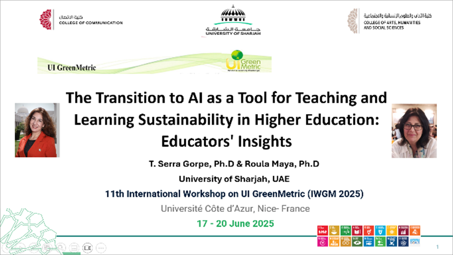 جامعة الشارقة تقدّم تجربتها في تعليم الاستدامة ودمج الذكاء الاصطناعي في المؤتمر الدولي الحادي عشر لـ UI Green Metric (IWGM 2025) ، في نيس، فرنسا