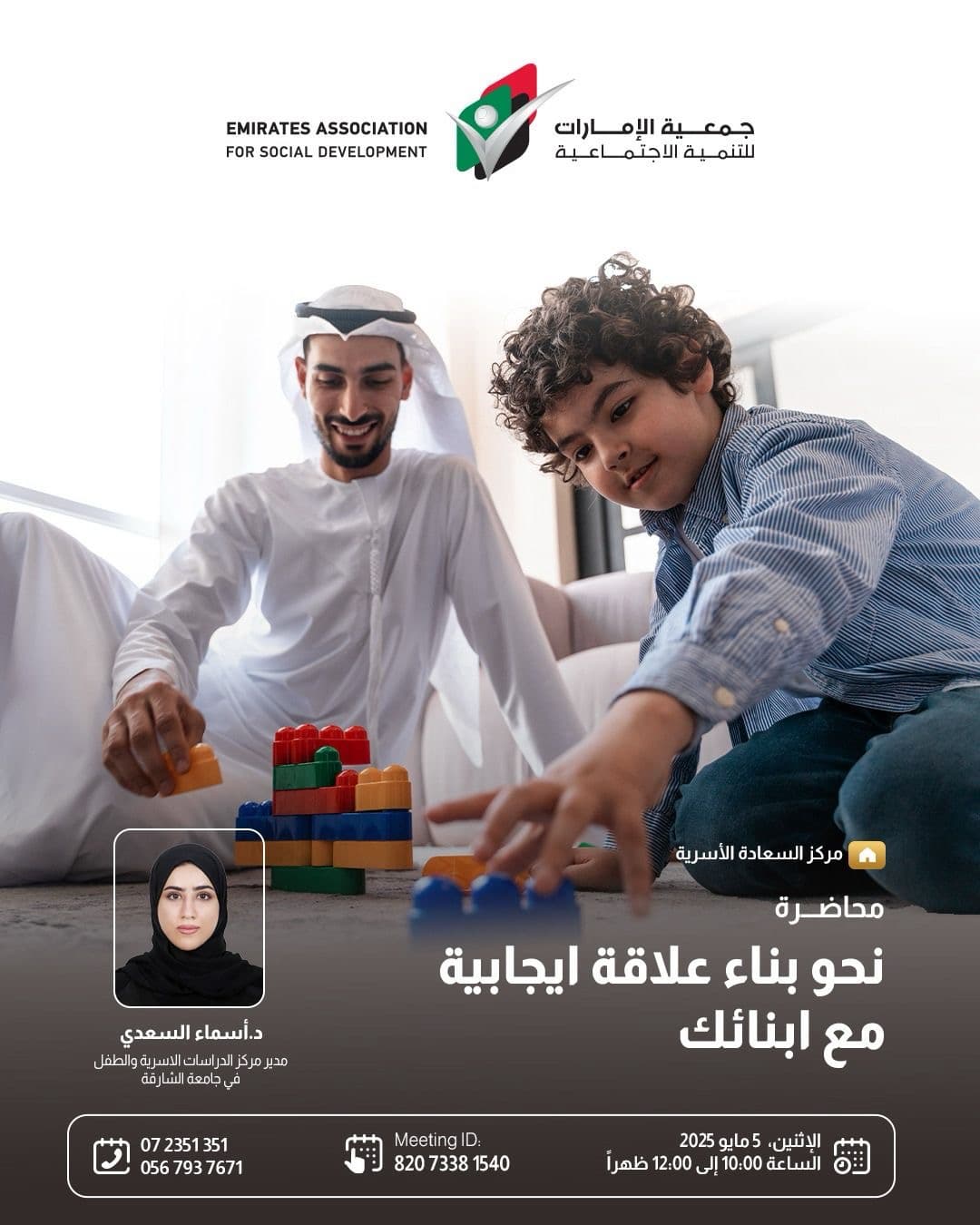 ساهمت الدكتورة أسماء السعدي في إعداد وتقديم ورشة عمل بعنوان "نحو بناء علاقة إيجابية مع أبنائك"، والتي تهدف إلى توجيه الأسر نحو تبني أساليب تربوية قائمة على الحوار، والتفاهم، والتعاطف مع الأبناء. تسعى هذه الورشة إلى تعزيز الروابط الأسرية وخلق بيئة داعمة لنمو الأطفال نفسيًا واجتماعيًا.