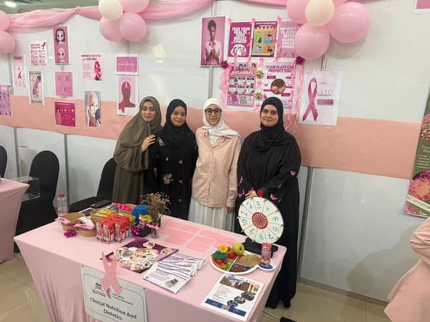 شارك طلاب قسم التغذية العلاجية والحميات بجامعة الشارقة في يوم التوعية بسرطان الثدي في 8 أكتوبر 2025، بهدف تعزيز الوعي بالوقاية من سرطان الثدي وأهمية التغذية السليمة في دعم الصحة العامة. وضم جناحهم ملصقات وكتيبات ونماذج غذائية توعوية تُسلط الضوء على الأنظمة الغذائية المتوازنة والأطعمة الغنية بالعناصر الغذائية التي تُسهم في تعزيز الصحة العامة. كما شارك الزوار في أنشطة تفاعلية، ووُزّعت عليهم هدايا تذكارية لتشجيعهم على اتباع نمط حياة صحي وإجراء فحوصات طبية دورية.